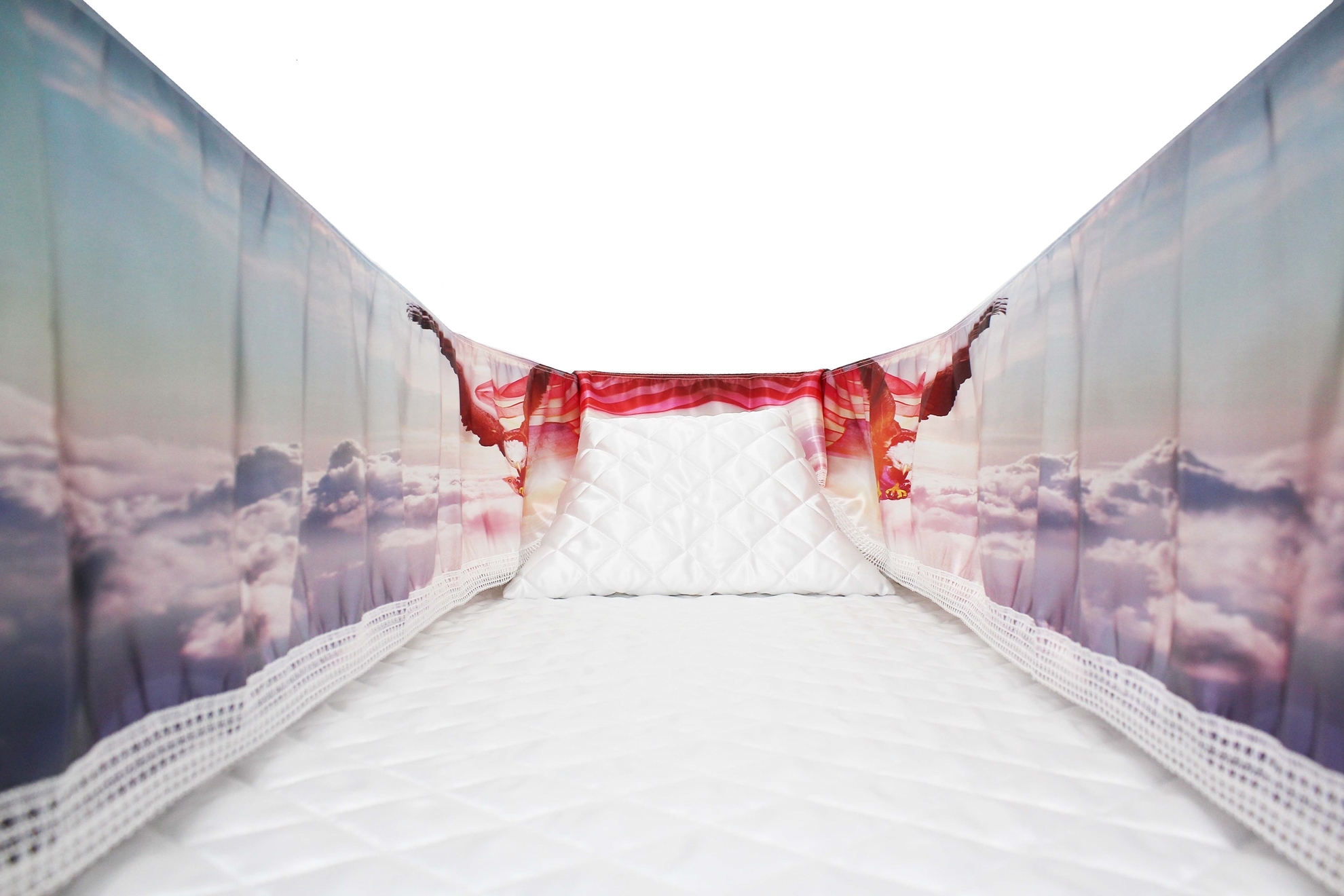 Luxury satin interior printed using water-based ink. The printed interior set consists of a 12-inch printed satin frill, printed satin facecloth, quilted satin pillow and a quilted satin mattress.