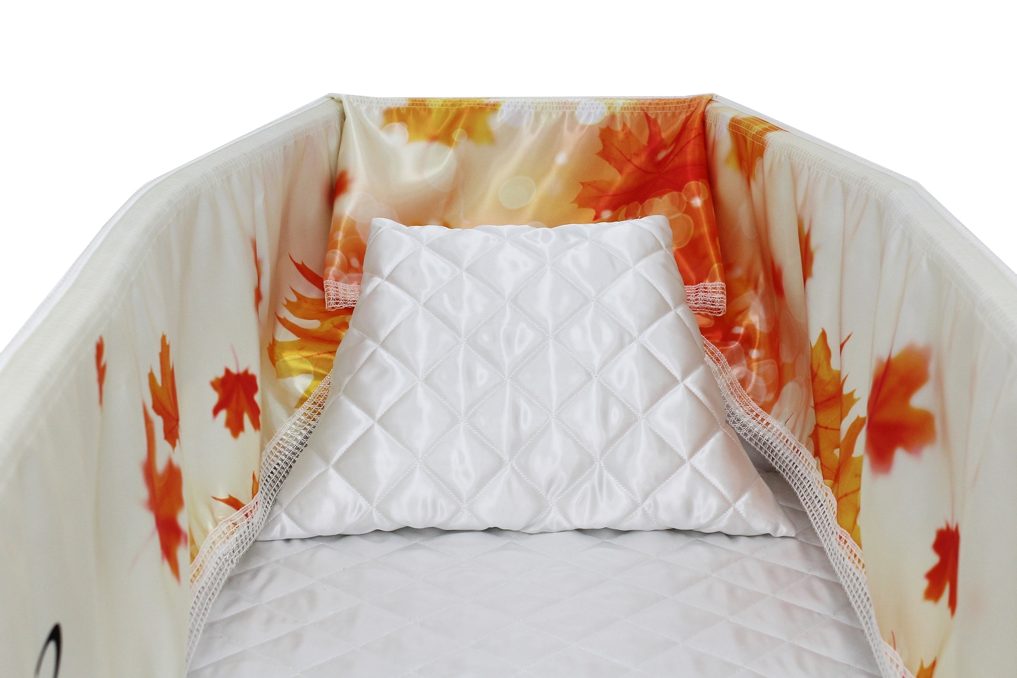 Luxury satin interior printed using water-based ink. The printed interior set consists of a 12-inch printed satin frill, printed satin facecloth, quilted satin pillow and a quilted satin mattress.