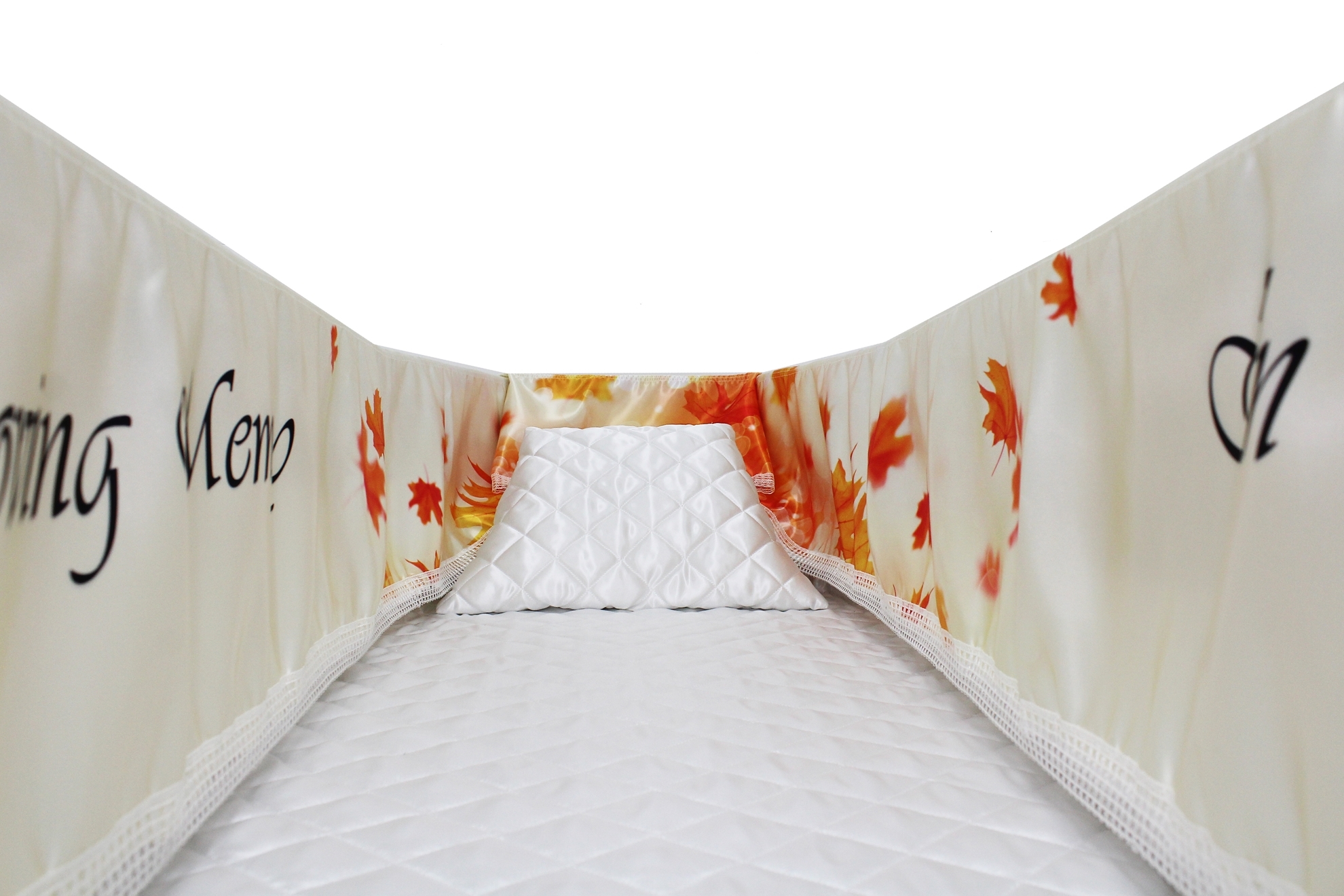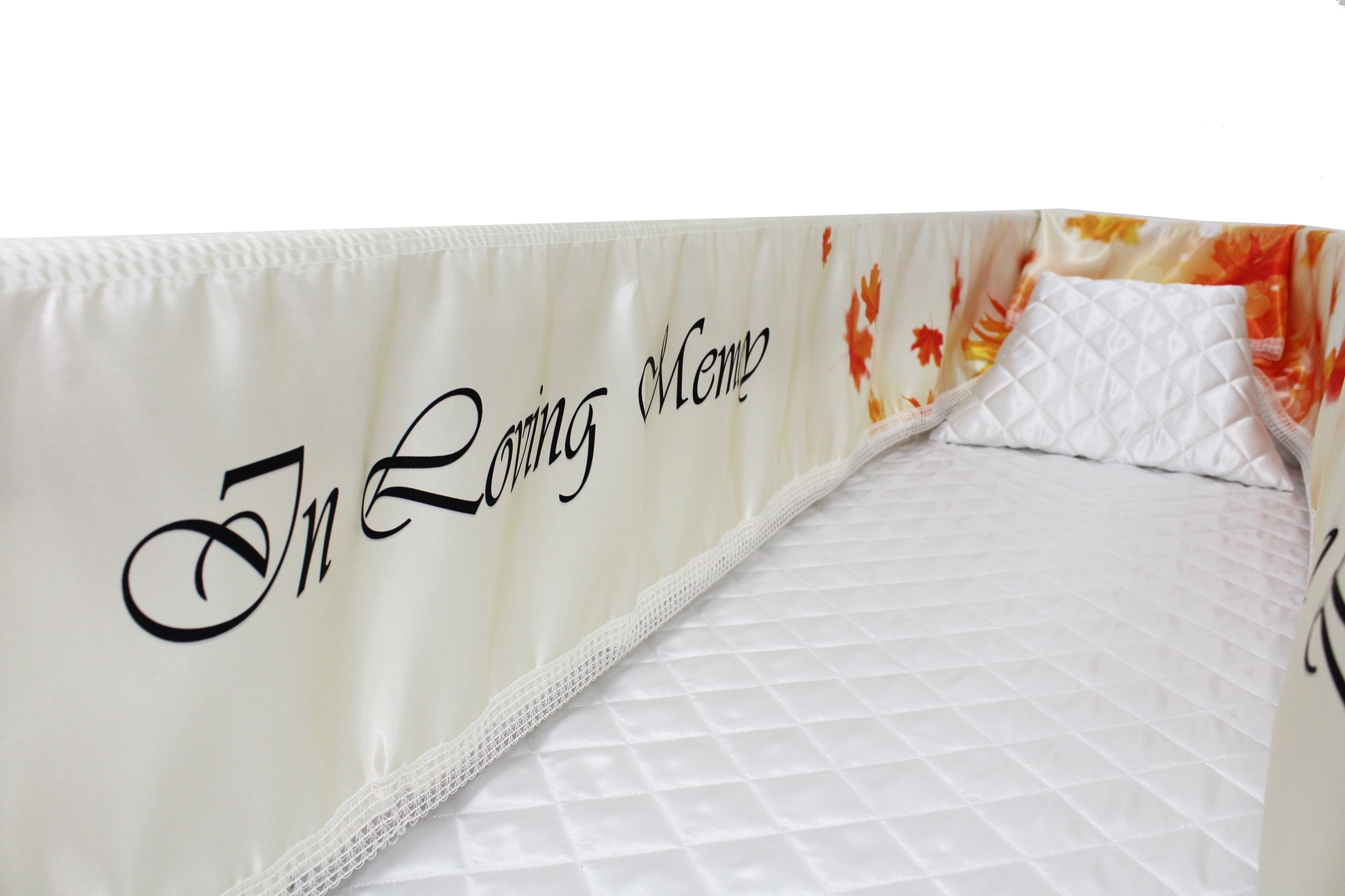 12-inch Printed Satin frill to be attached to the lip of the coffin/casket. Please note the image shows a mattress and pillow which are NOT included.