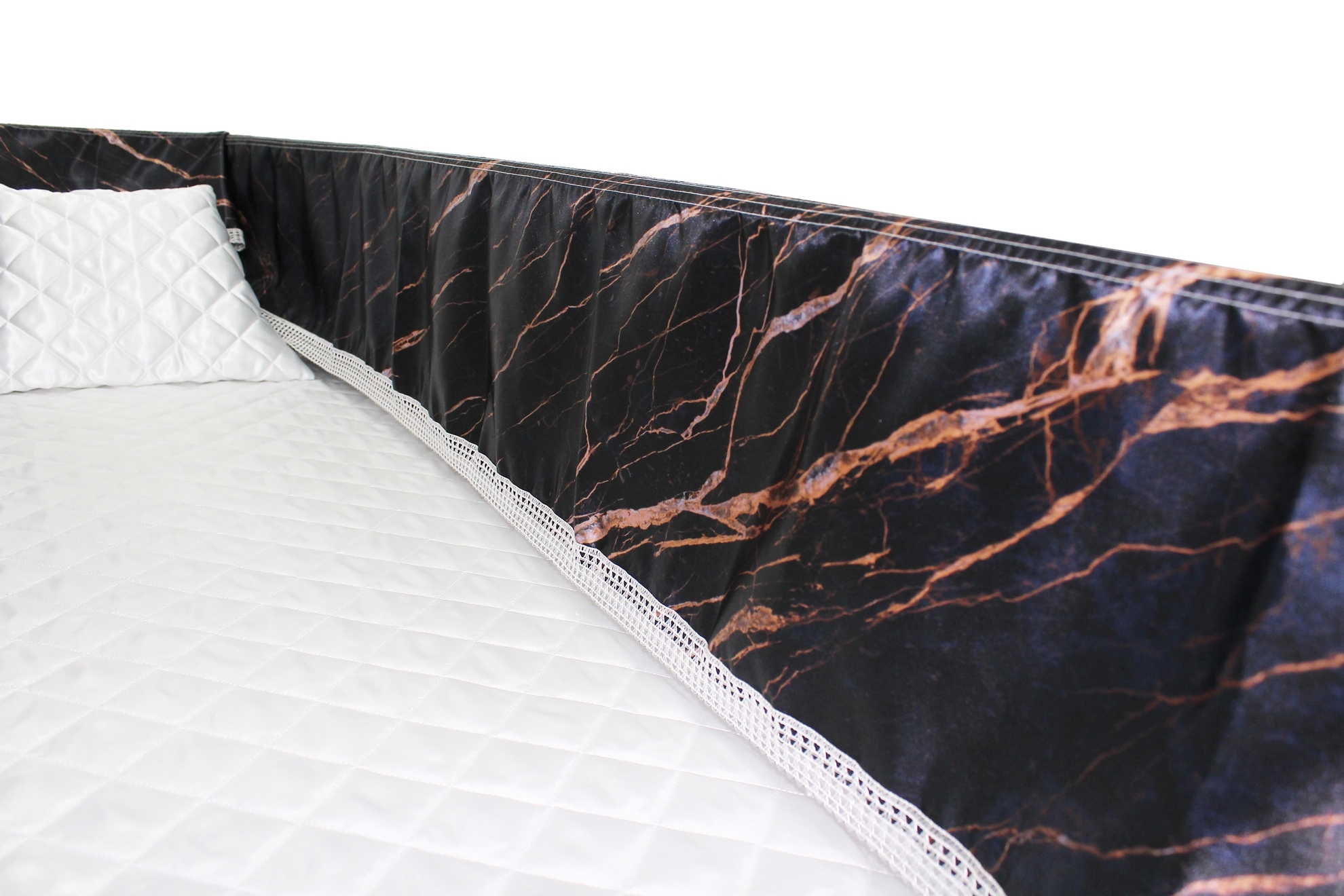 Luxury Satin 18-inch 2-way frill consisting of a 12-inch internal frill with an additional 6-inch exterior frill. The chosen design will be printed on the 18" 2-Way Frill. Please note the image shows a mattress and a pillow which are NOT included. Image is to illustrate style of Interior Only.