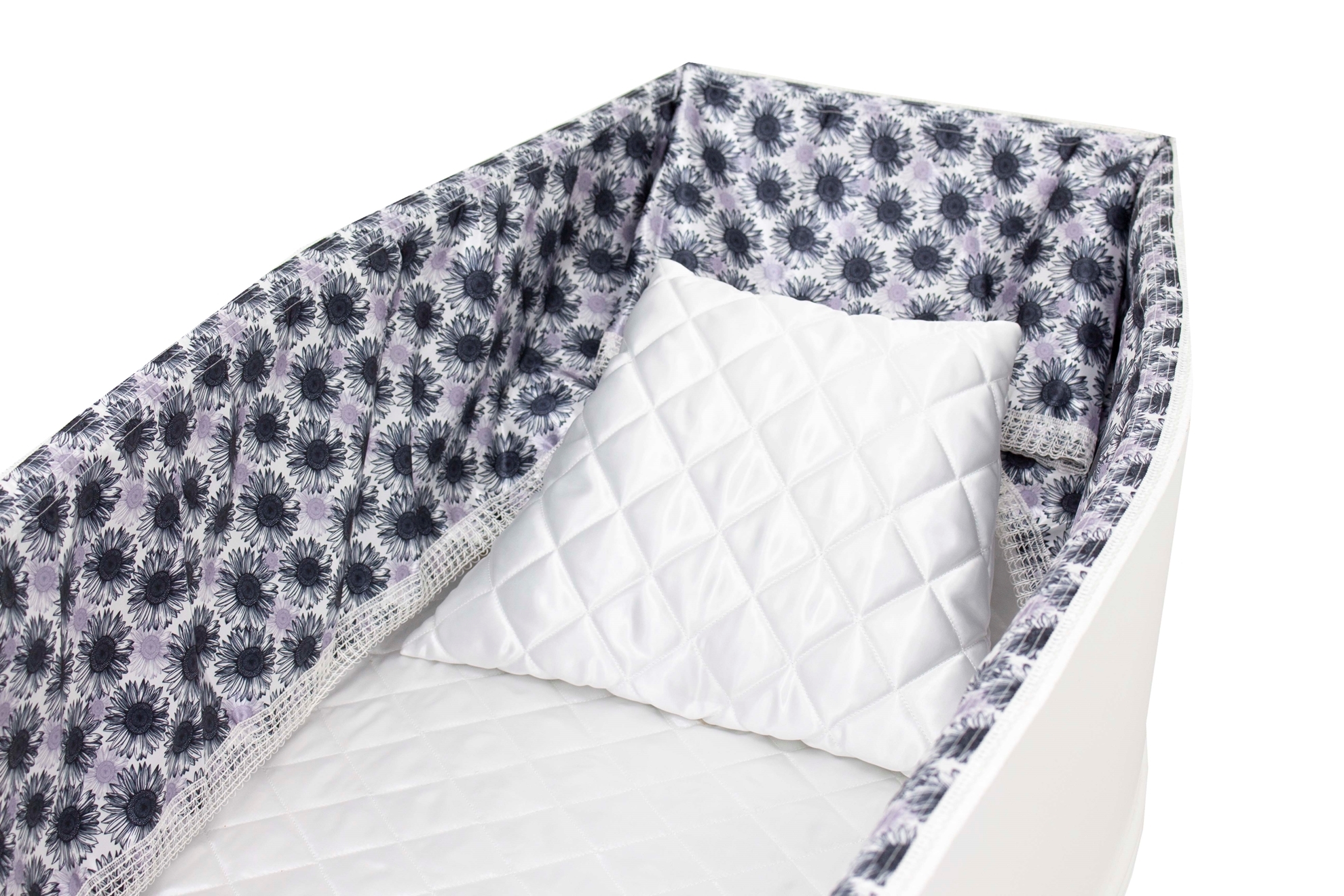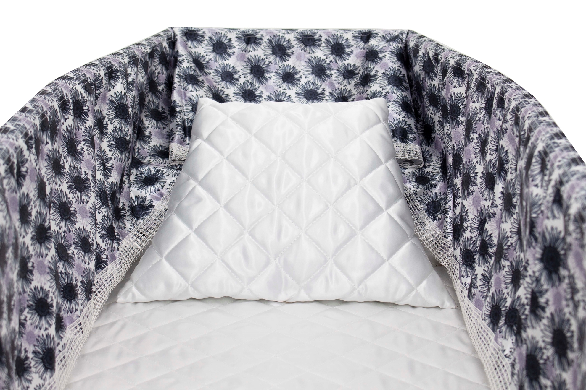 Luxury satin interior printed using water-based ink. The printed interior set consists of a 12-inch printed satin frill, printed satin facecloth, quilted satin pillow and a quilted satin mattress.