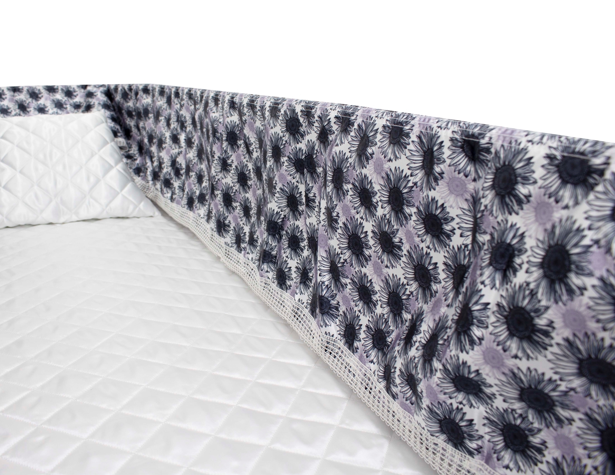 Luxury Satin 18-inch 2-way frill consisting of a 12-inch internal frill with an additional 6-inch exterior frill. The chosen design will be printed on the 18" 2-Way Frill. Please note the image shows a mattress and a pillow which are NOT included. Image is to illustrate style of Interior Only.