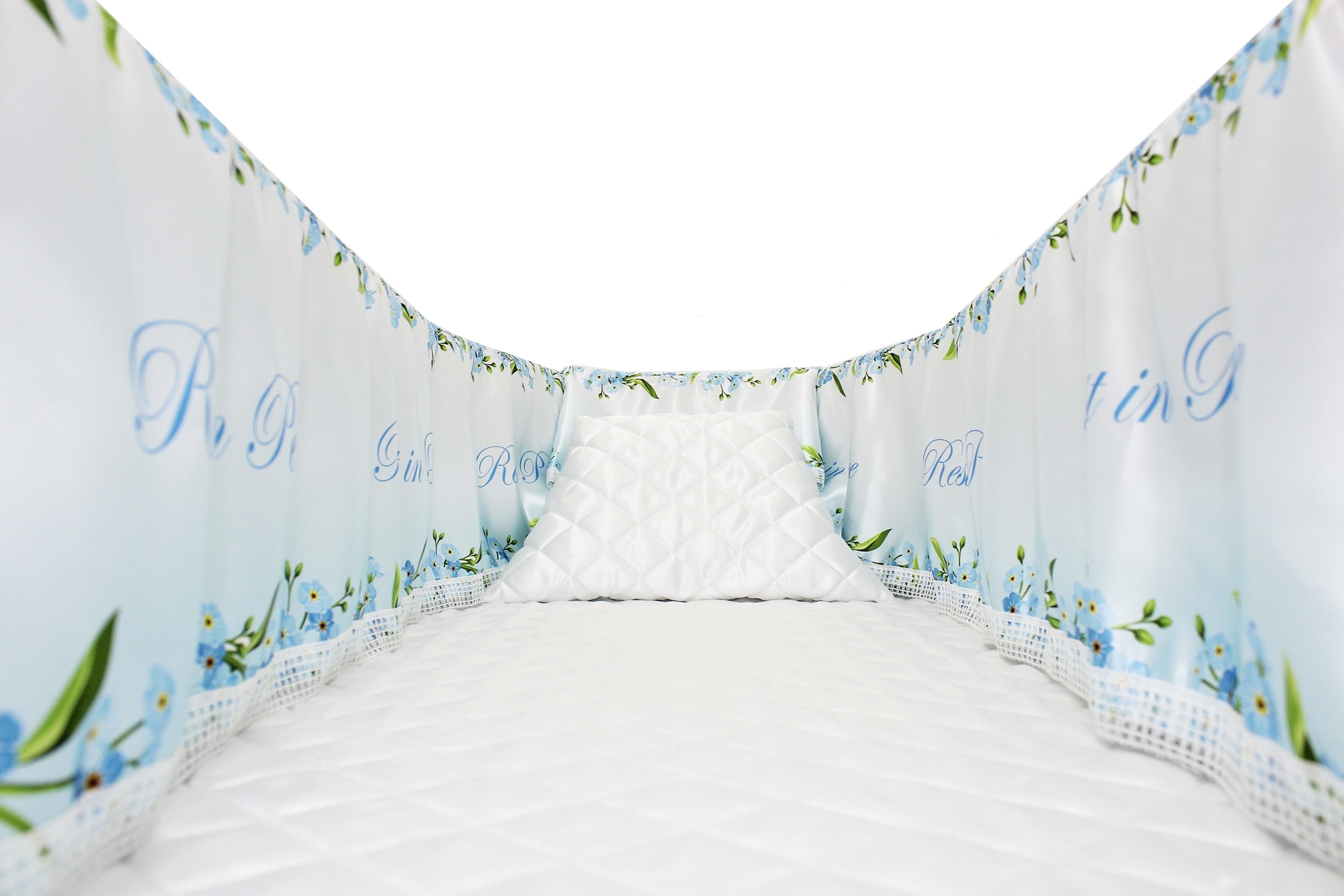 Luxury satin interior printed using water-based ink. The printed interior set consists of a 12-inch printed satin frill, printed satin facecloth, quilted satin pillow and a quilted satin mattress.