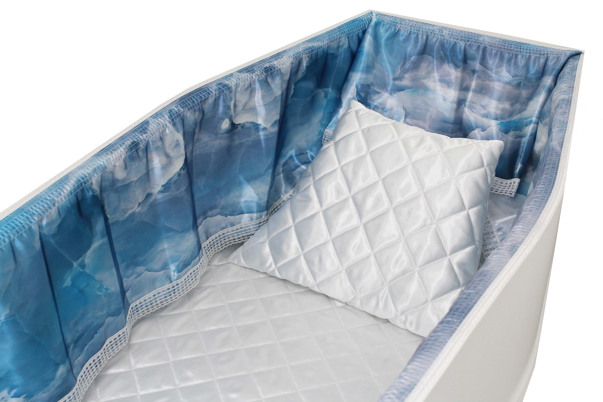 Luxury satin interior printed using water-based ink. The printed interior set consists of a 18-inch 2 Way printed satin frill, printed satin facecloth, quilted satin pillow and a quilted satin mattress.The chosen design will be printed on the interior. Image is to illustrate style of Interior Only.