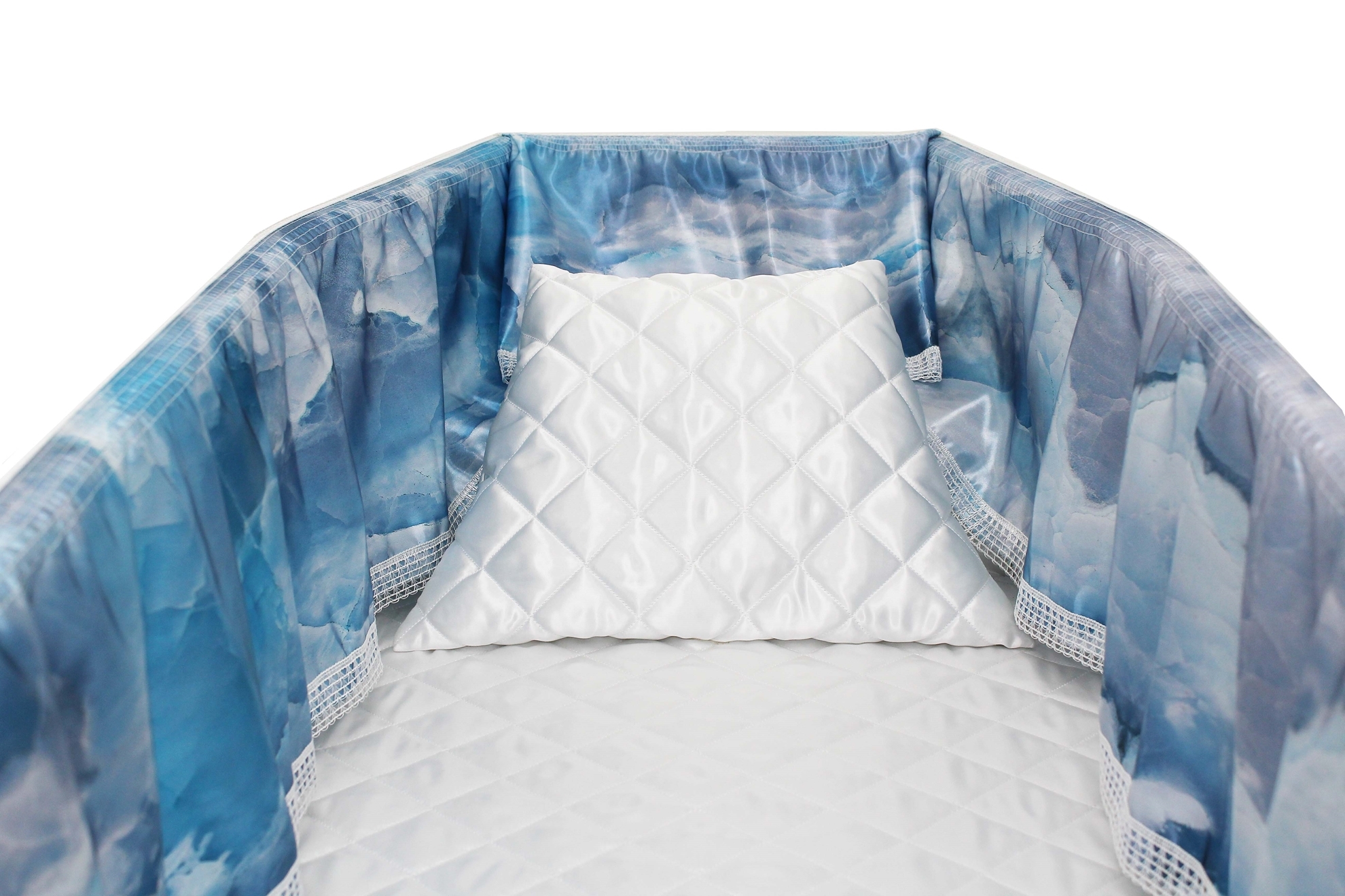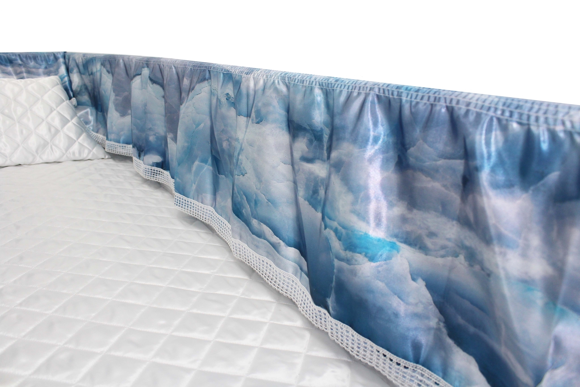 Luxury Satin 18-inch 2-way frill consisting of a 12-inch internal frill with an additional 6-inch exterior frill. The chosen design will be printed on the 18" 2-Way Frill. Please note the image shows a mattress and a pillow which are NOT included. Image is to illustrate style of Interior Only.