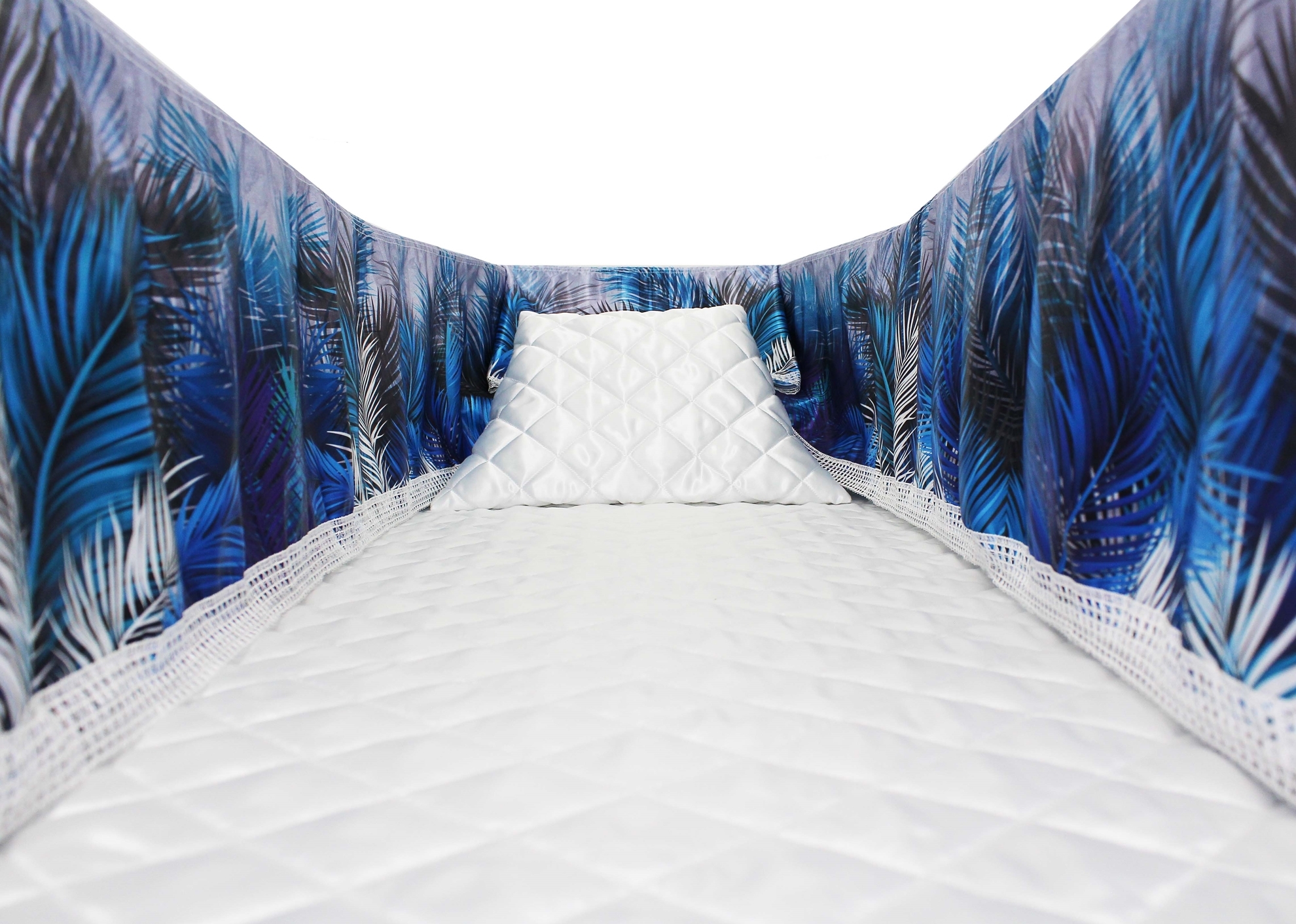 Luxury satin interior printed using water-based ink. The printed interior set consists of a 12-inch printed satin frill, printed satin facecloth, quilted satin pillow and a quilted satin mattress.