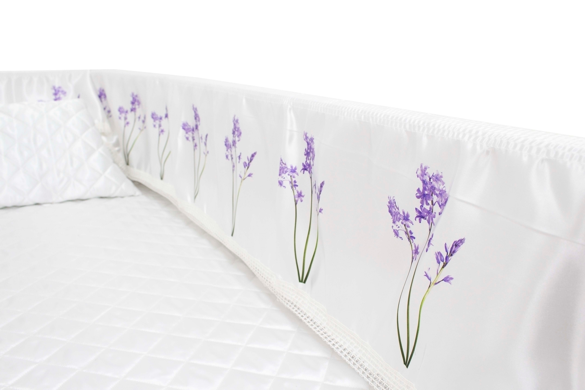 Luxury satin interior printed using water-based ink. The printed interior set consists of a 18-inch 2 Way printed satin frill, printed satin facecloth, quilted satin pillow and a quilted satin mattress.The chosen design will be printed on the interior. Image is to illustrate style of Interior Only.