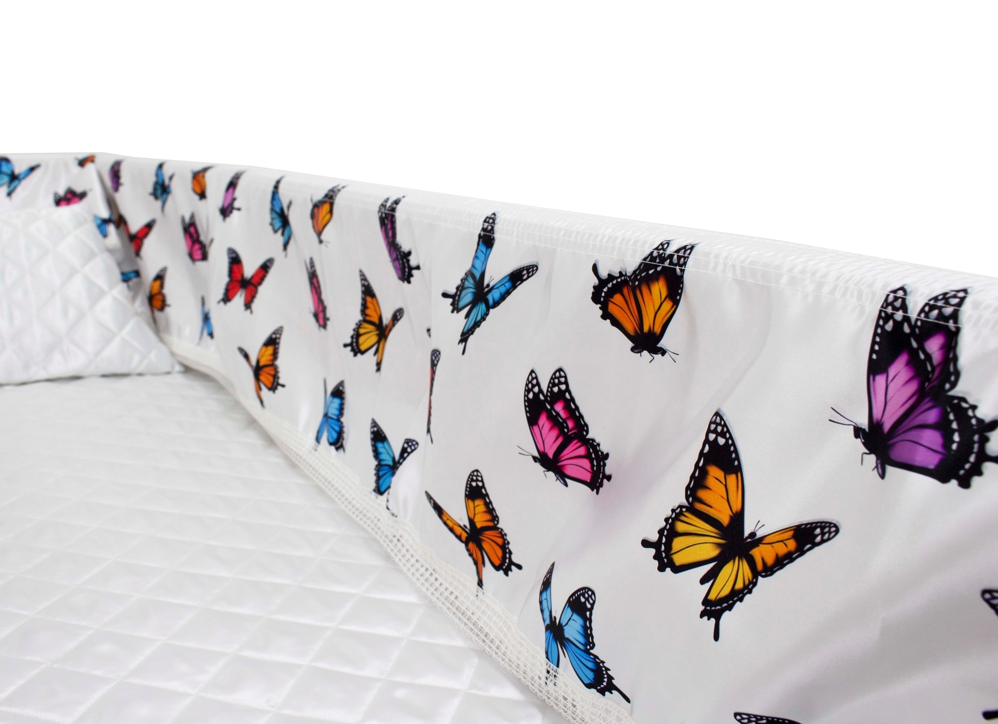 Luxury Satin 18-inch 2-way frill consisting of a 12-inch internal frill with an additional 6-inch exterior frill. The chosen design will be printed on the 18" 2-Way Frill. Please note the image shows a mattress and a pillow which are NOT included. Image is to illustrate style of Interior Only.