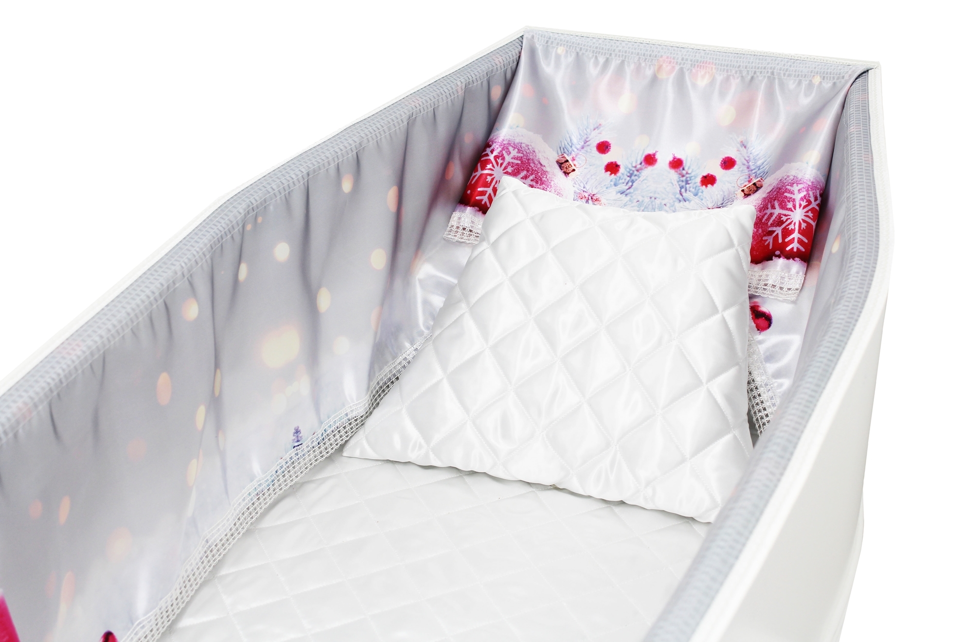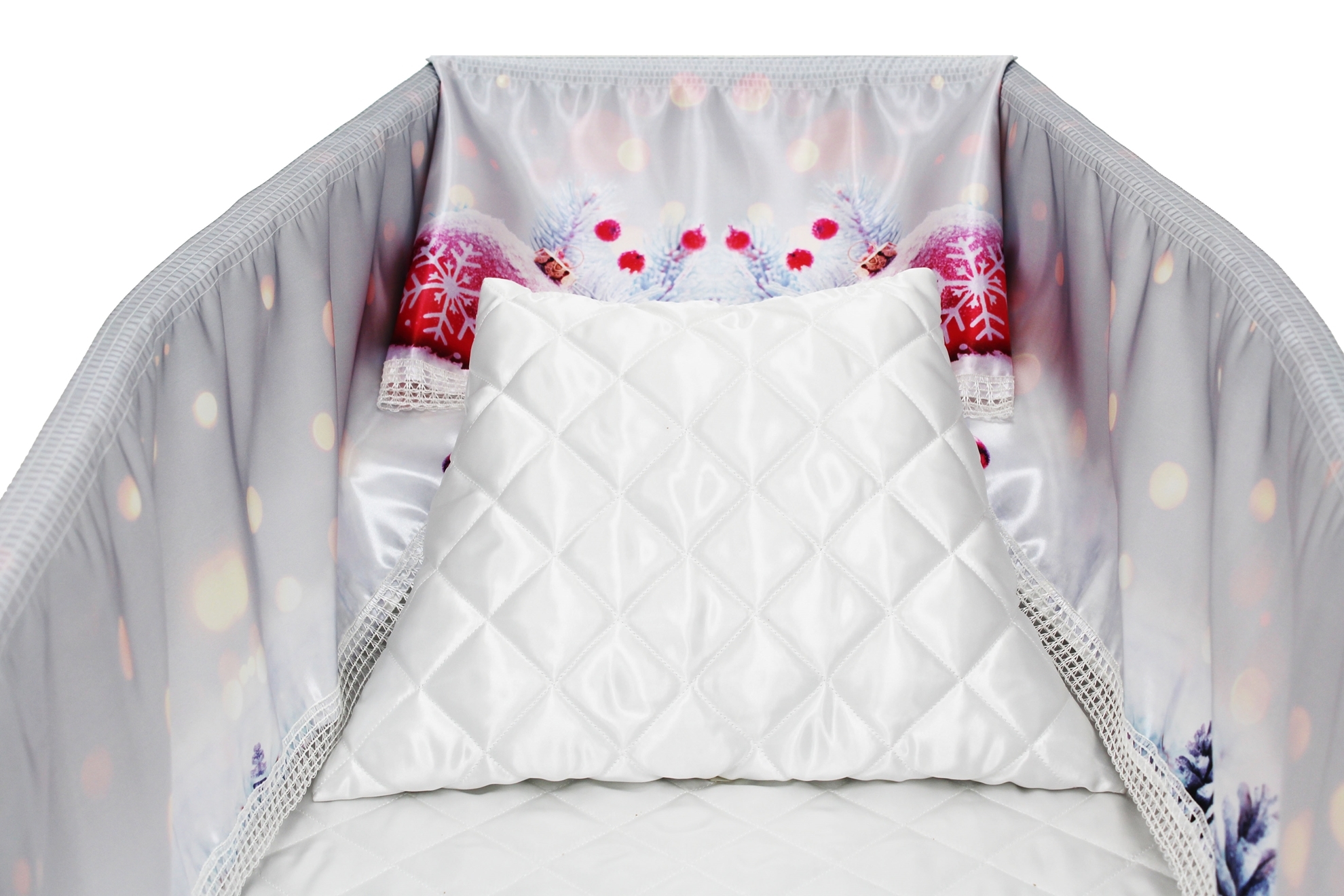 Luxury satin interior printed using water-based ink. The printed interior set consists of a 12-inch printed satin frill, printed satin facecloth, quilted satin pillow and a quilted satin mattress.