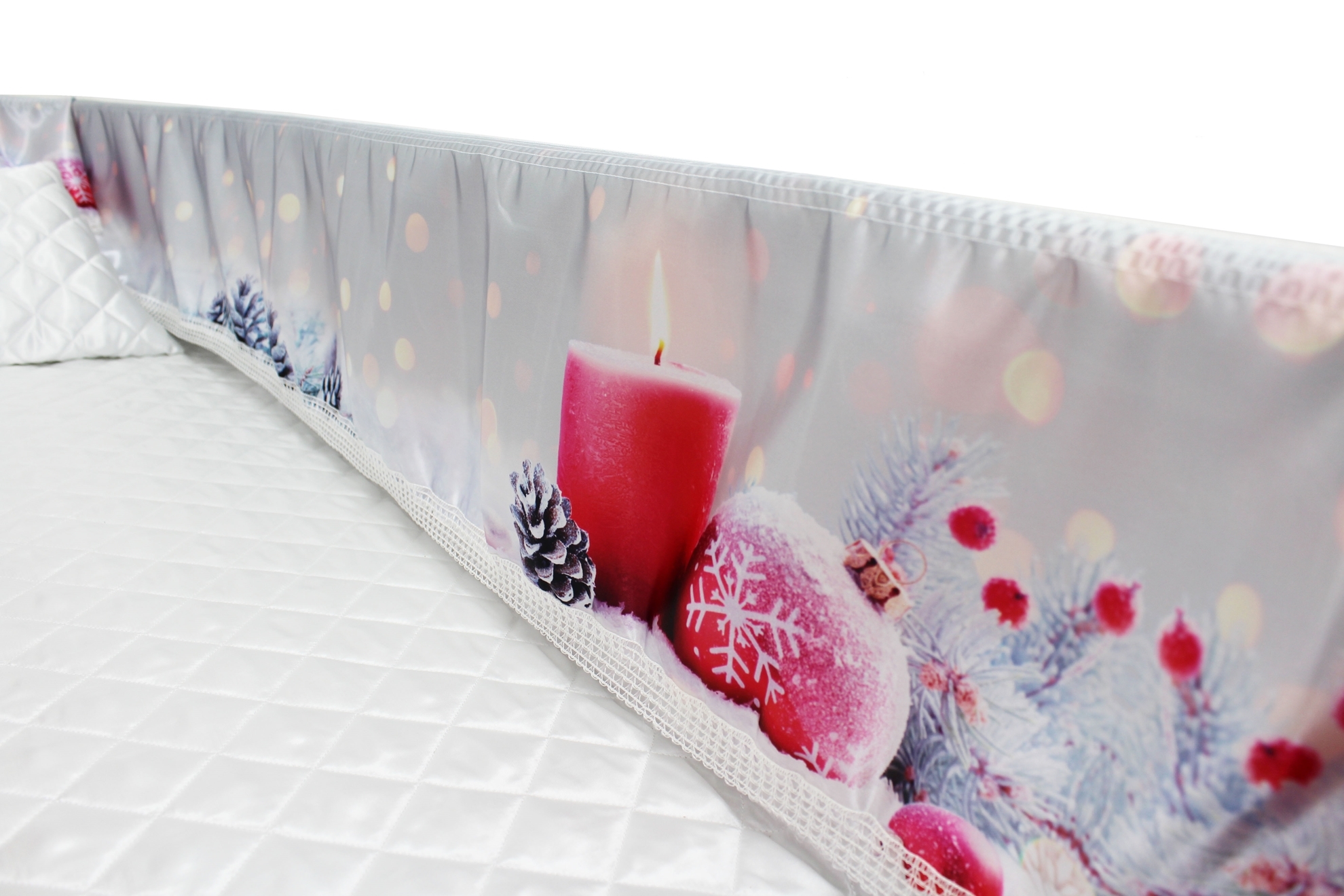 Luxury Satin 18-inch 2-way frill consisting of a 12-inch internal frill with an additional 6-inch exterior frill. The chosen design will be printed on the 18" 2-Way Frill. Please note the image shows a mattress and a pillow which are NOT included. Image is to illustrate style of Interior Only.