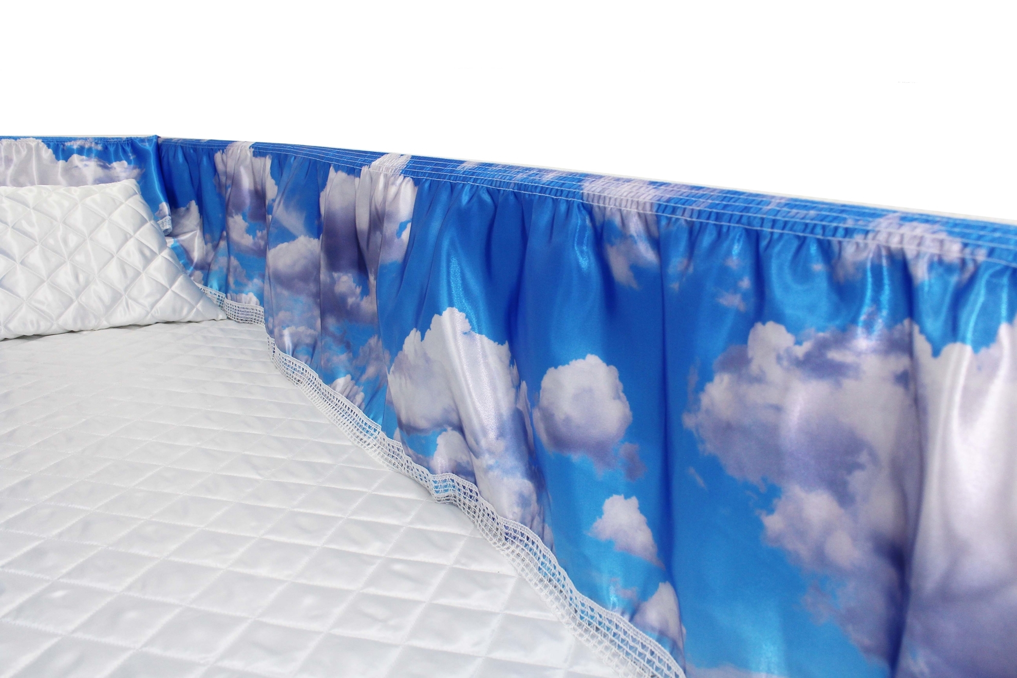 Luxury Satin 18-inch 2-way frill consisting of a 12-inch internal frill with an additional 6-inch exterior frill. The chosen design will be printed on the 18" 2-Way Frill. Please note the image shows a mattress and a pillow which are NOT included. Image is to illustrate style of Interior Only.