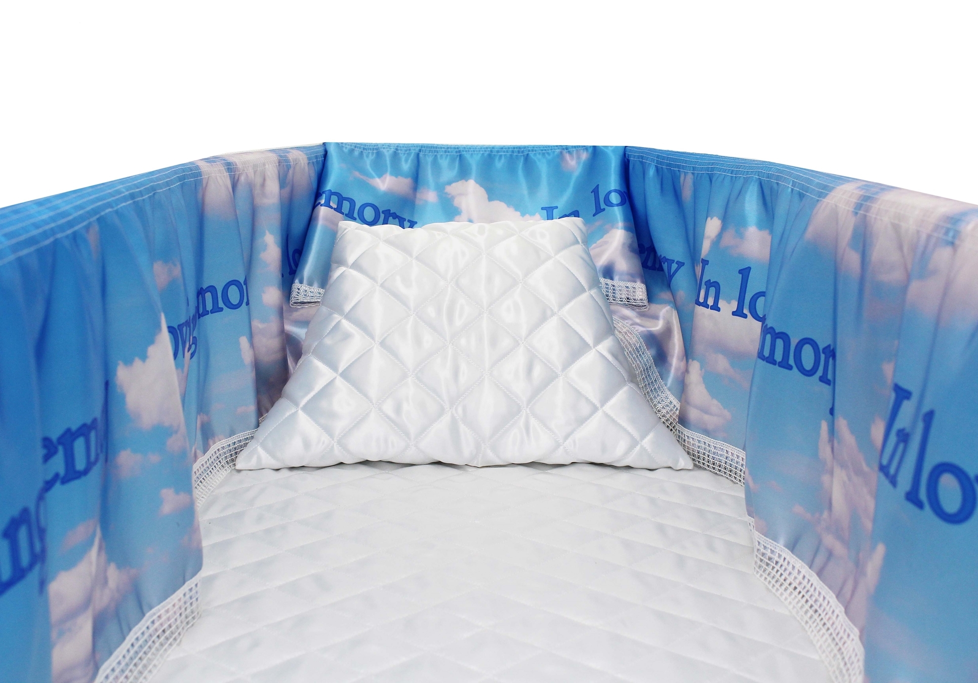 Luxury satin interior printed using water-based ink. The printed interior set consists of a 12-inch printed satin frill, printed satin facecloth, quilted satin pillow and a quilted satin mattress.