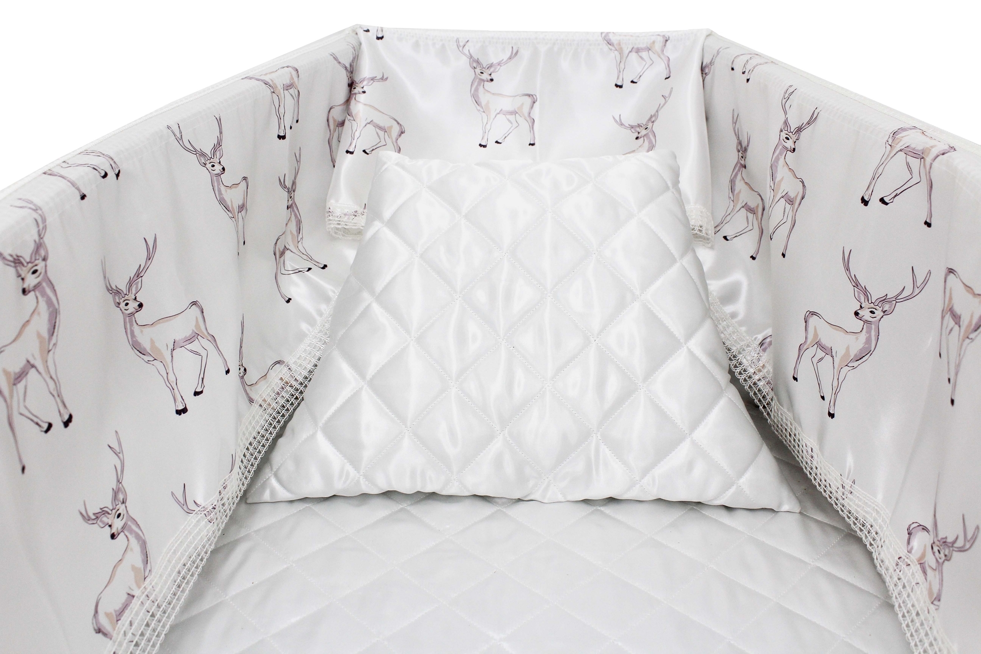Luxury satin interior printed using water-based ink. The printed interior set consists of a 12-inch printed satin frill, printed satin facecloth, quilted satin pillow and a quilted satin mattress.