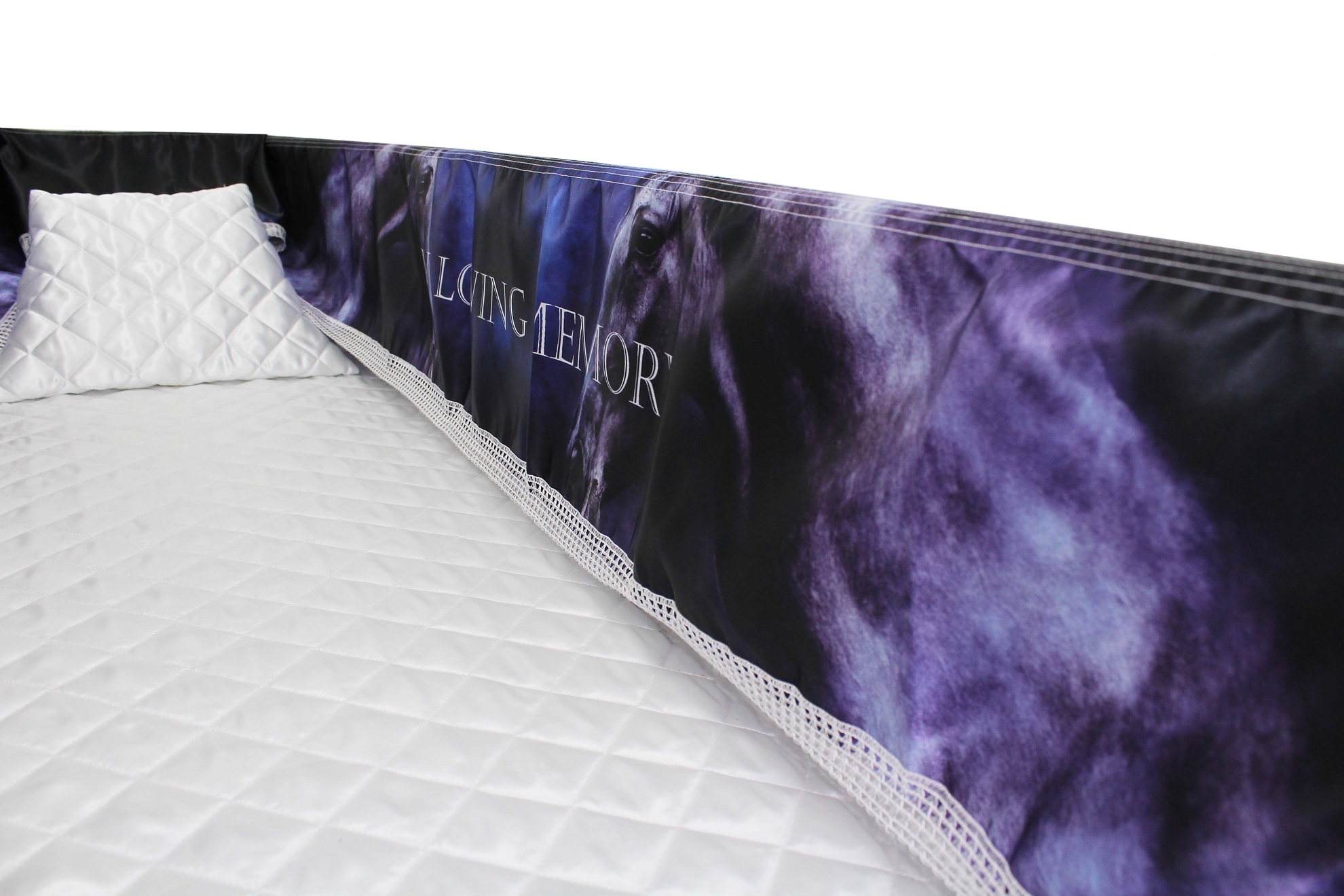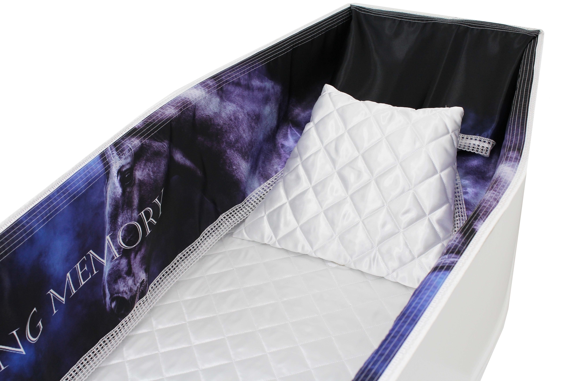 Luxury satin interior printed using water-based ink. The printed interior set consists of a 18-inch 2 Way printed satin frill, printed satin facecloth, quilted satin pillow and a quilted satin mattress.The chosen design will be printed on the interior. Image is to illustrate style of Interior Only.