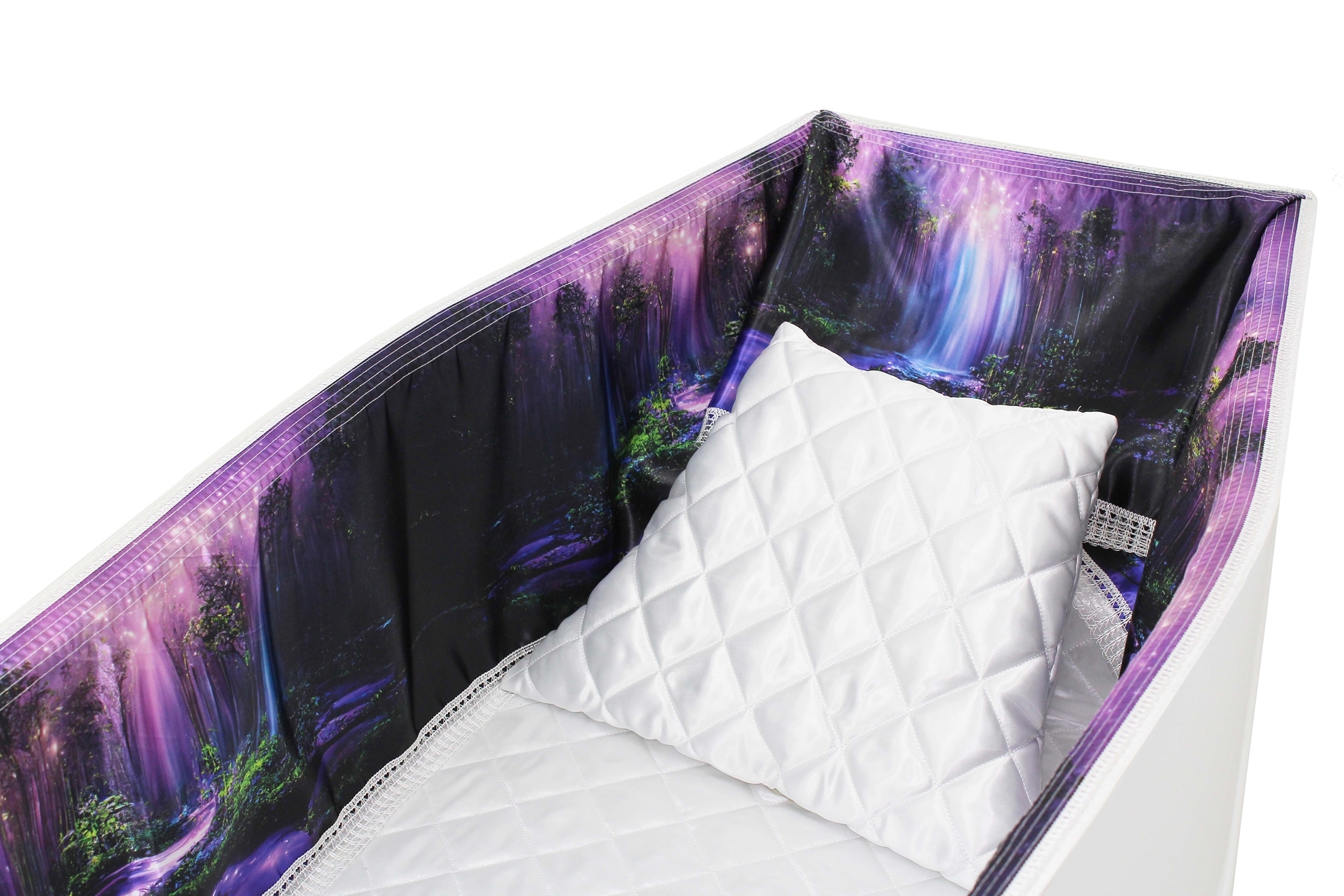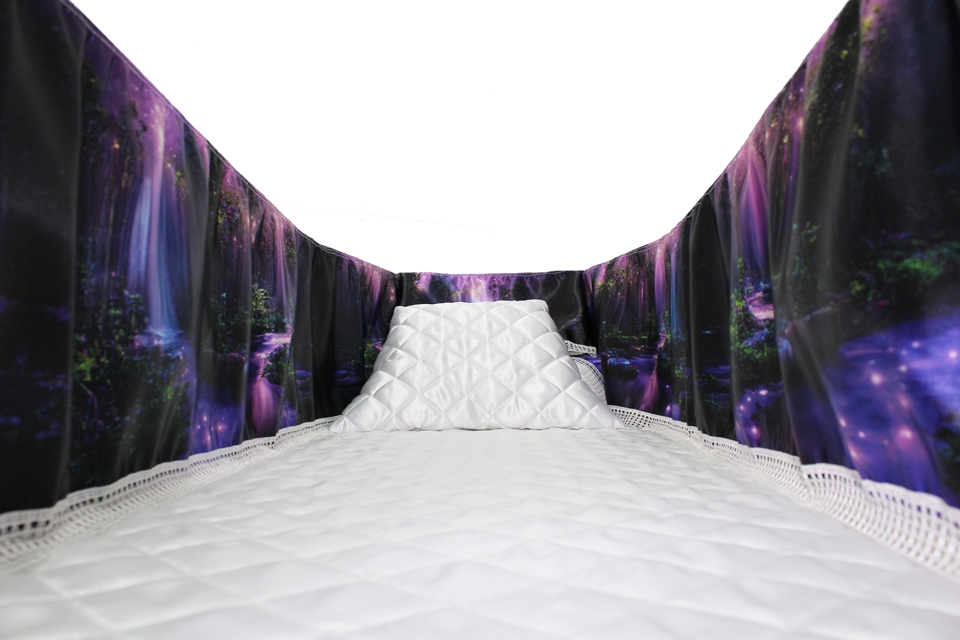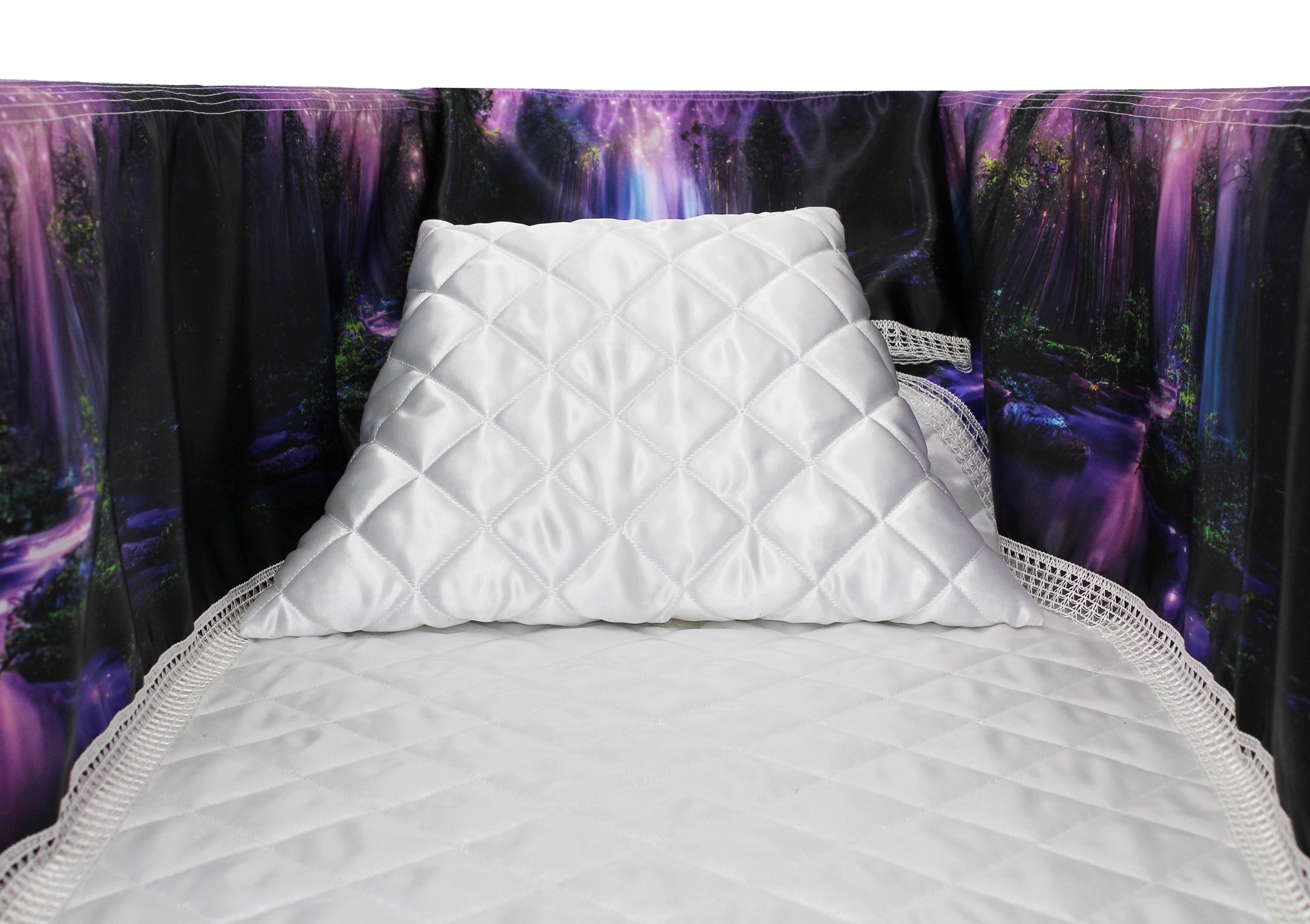 Luxury satin interior printed using water-based ink. The printed interior set consists of a 18-inch 2 Way printed satin frill, printed satin facecloth, quilted satin pillow and a quilted satin mattress.The chosen design will be printed on the interior. Image is to illustrate style of Interior Only.