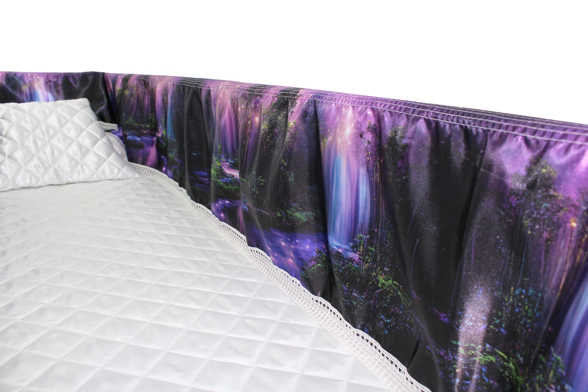 Luxury Satin 18-inch 2-way frill consisting of a 12-inch internal frill with an additional 6-inch exterior frill. The chosen design will be printed on the 18" 2-Way Frill. Please note the image shows a mattress and a pillow which are NOT included. Image is to illustrate style of Interior Only.