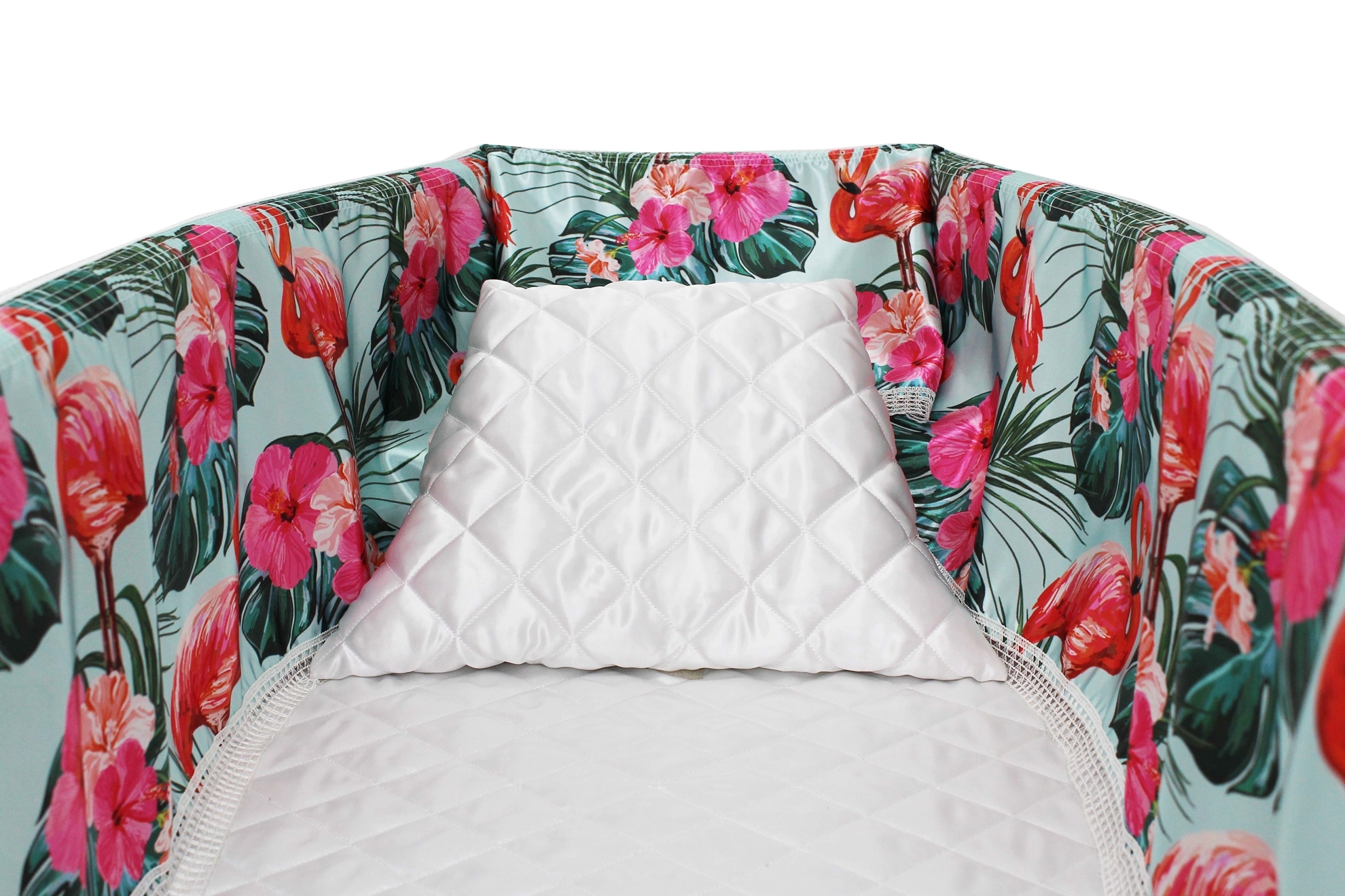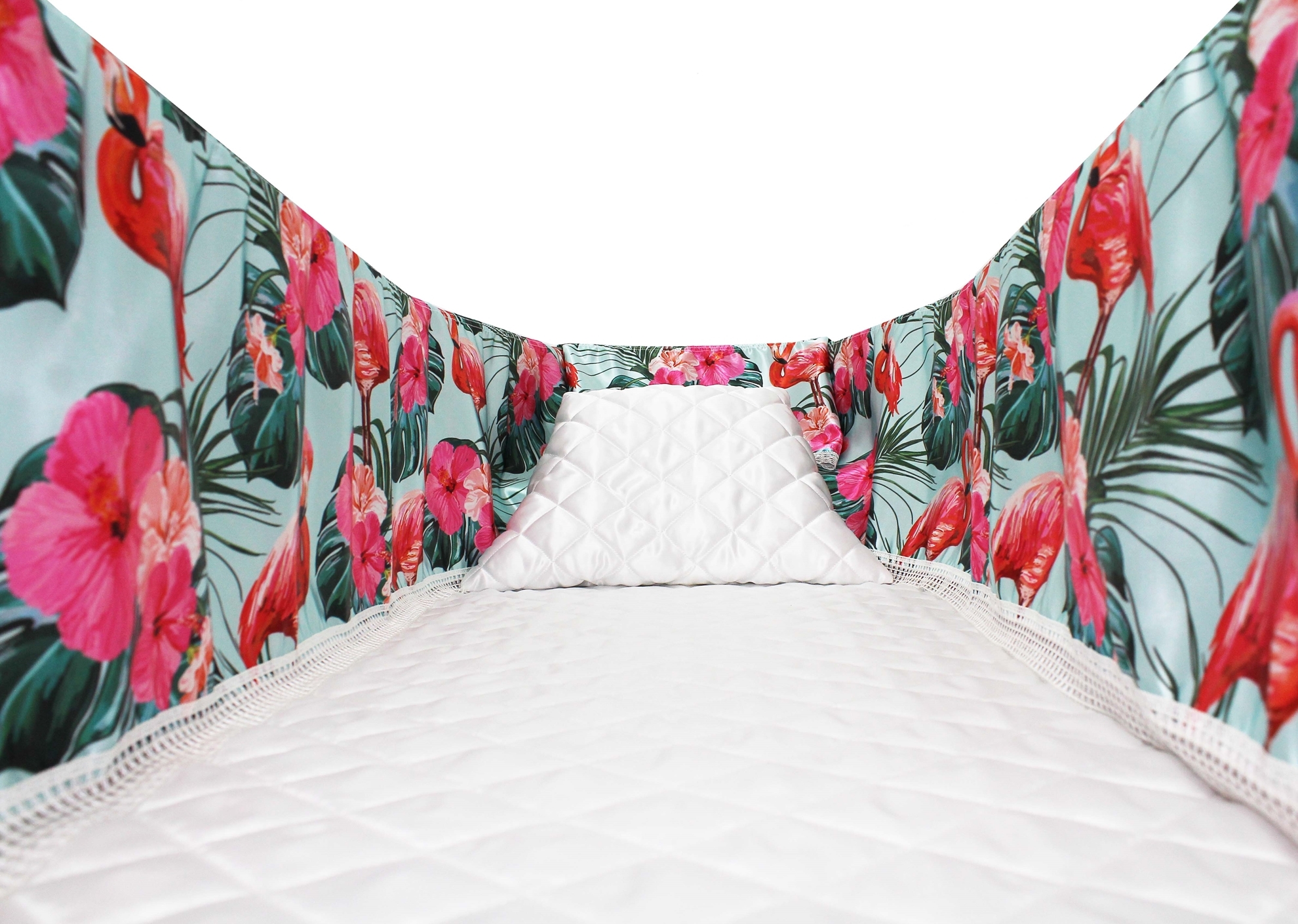 Luxury satin interior printed using water-based ink. The printed interior set consists of a 12-inch printed satin frill, printed satin facecloth, quilted satin pillow and a quilted satin mattress.