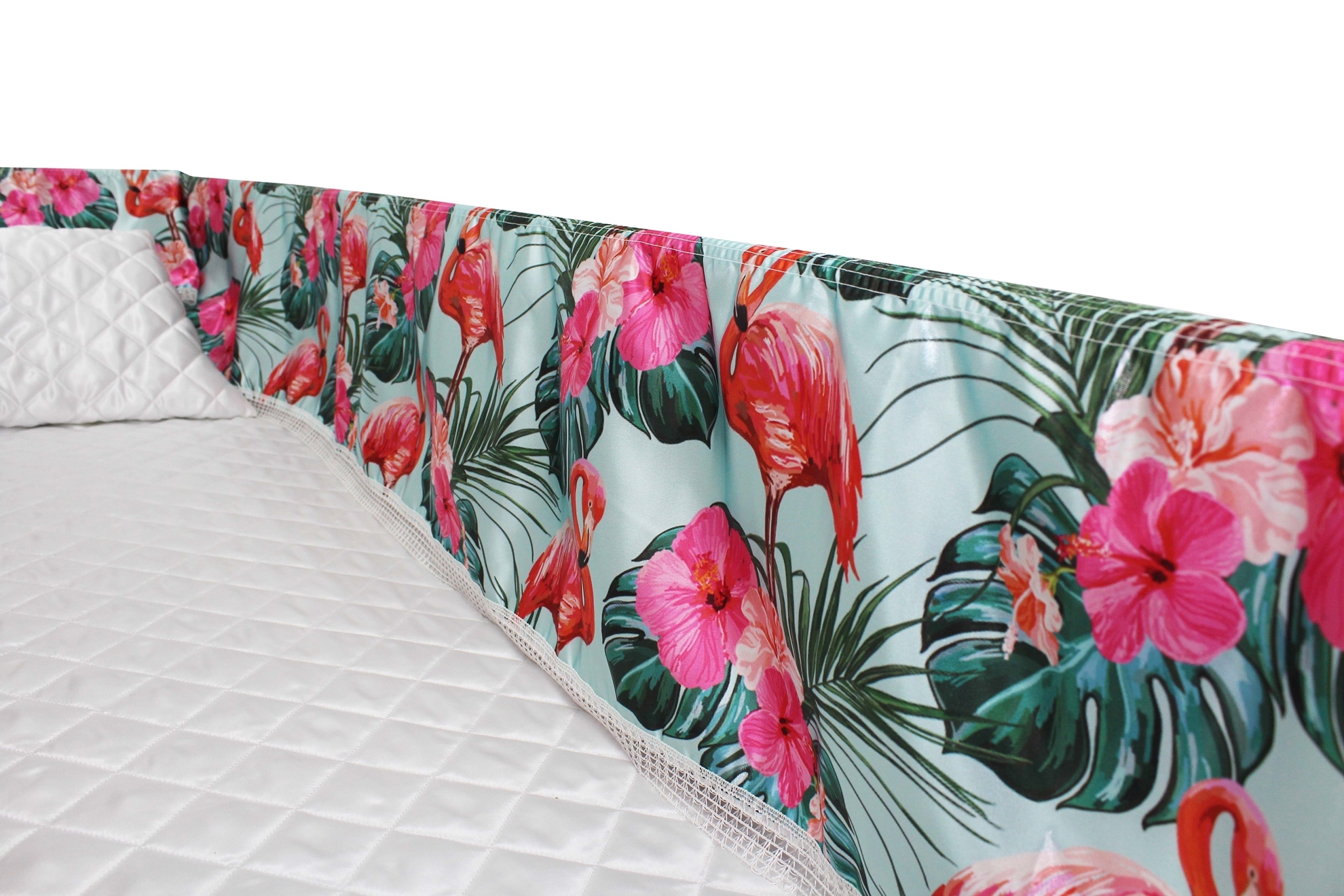 Luxury Satin 18-inch 2-way frill consisting of a 12-inch internal frill with an additional 6-inch exterior frill. The chosen design will be printed on the 18" 2-Way Frill. Please note the image shows a mattress and a pillow which are NOT included. Image is to illustrate style of Interior Only.