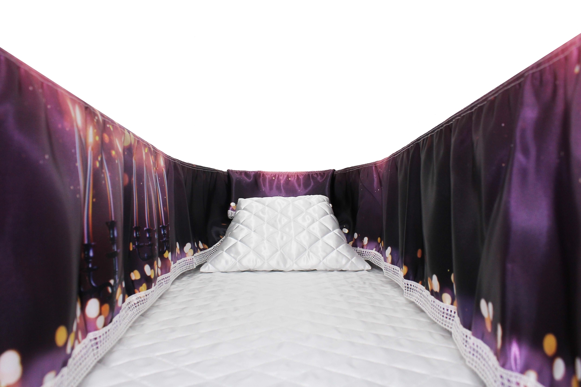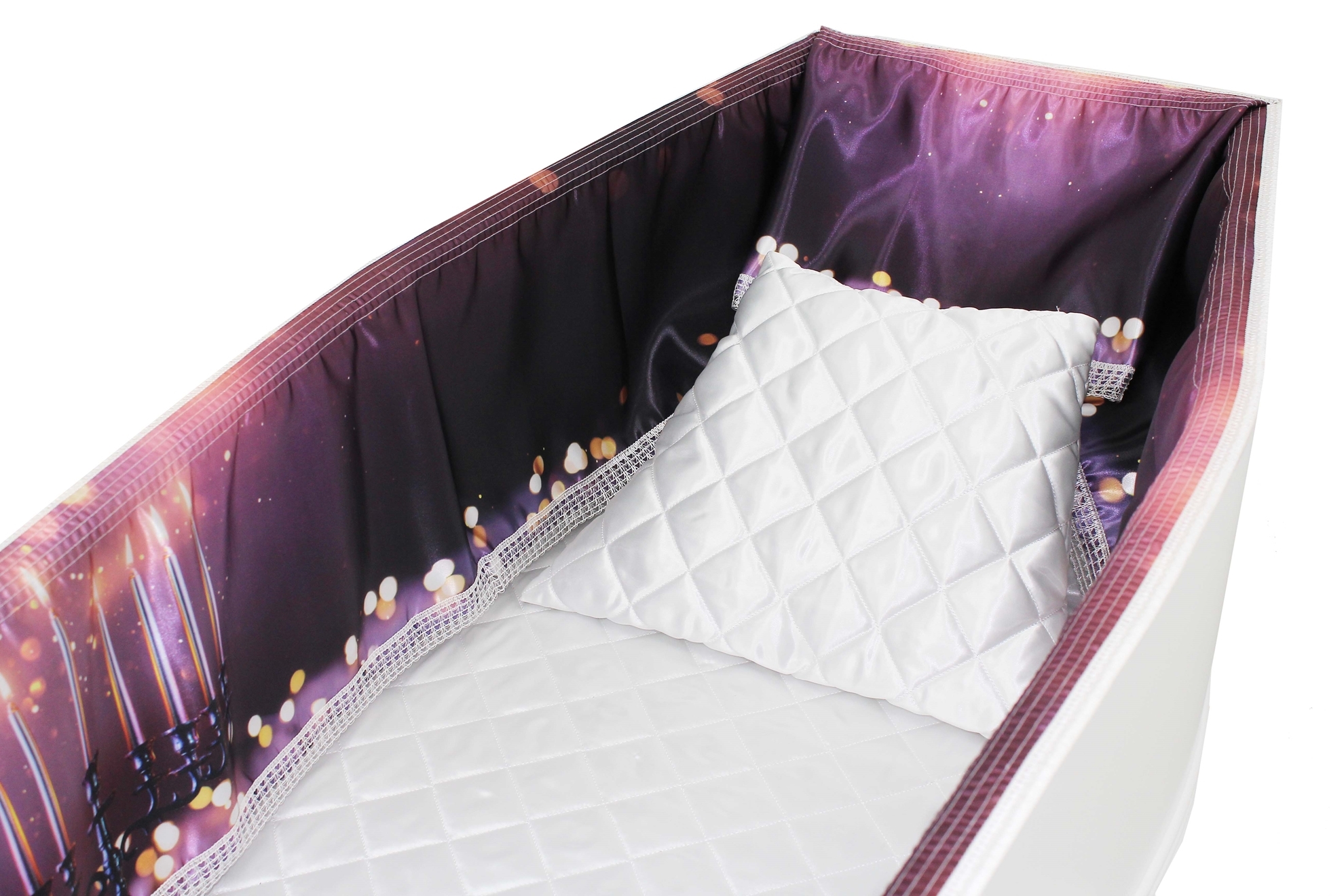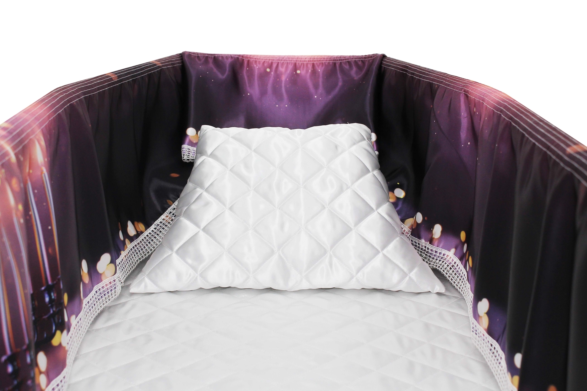 Luxury satin interior printed using water-based ink. The printed interior set consists of a 18-inch 2 Way printed satin frill, printed satin facecloth, quilted satin pillow and a quilted satin mattress.The chosen design will be printed on the interior. Image is to illustrate style of Interior Only.