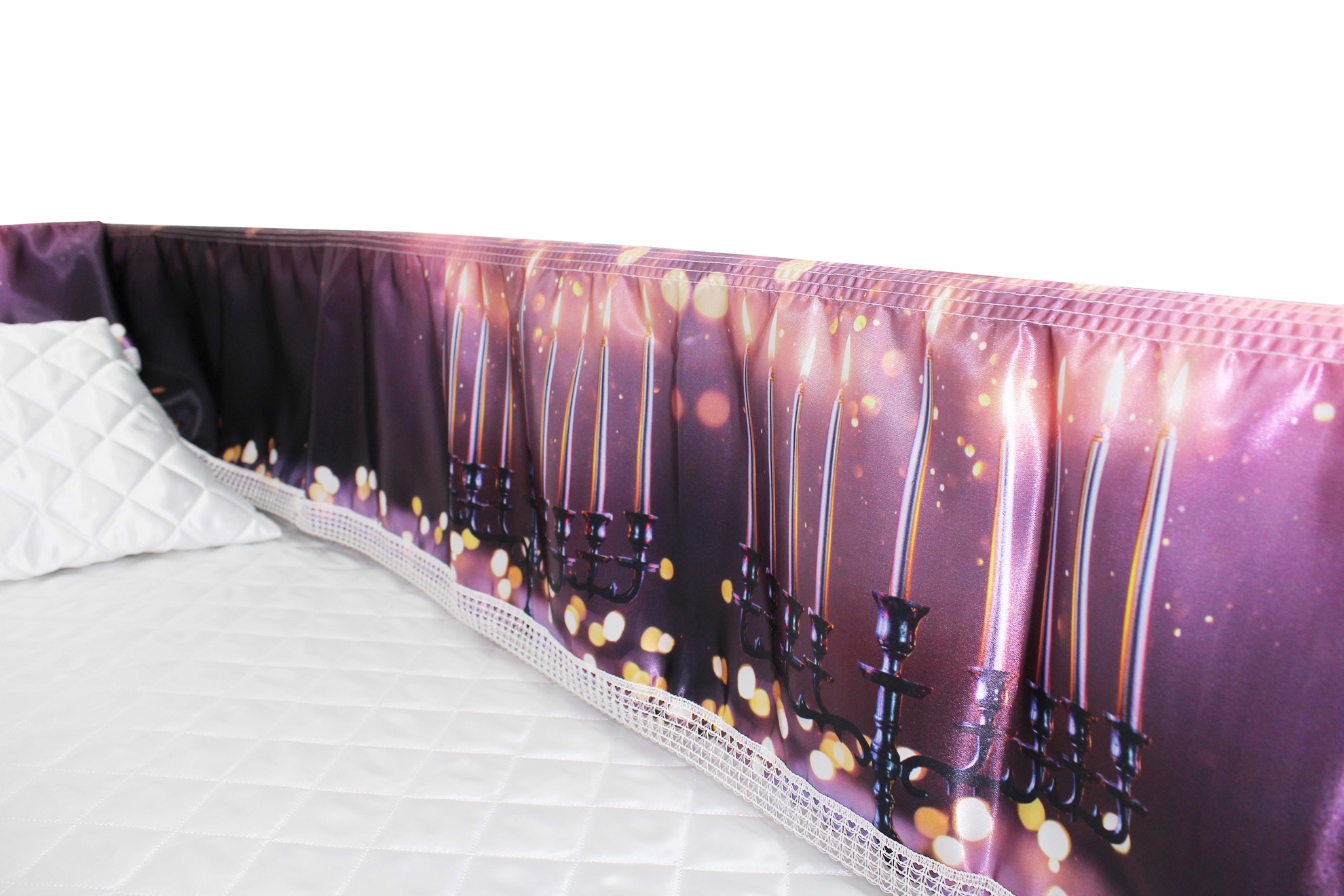 Luxury Satin 18-inch 2-way frill consisting of a 12-inch internal frill with an additional 6-inch exterior frill. The chosen design will be printed on the 18" 2-Way Frill. Please note the image shows a mattress and a pillow which are NOT included. Image is to illustrate style of Interior Only.