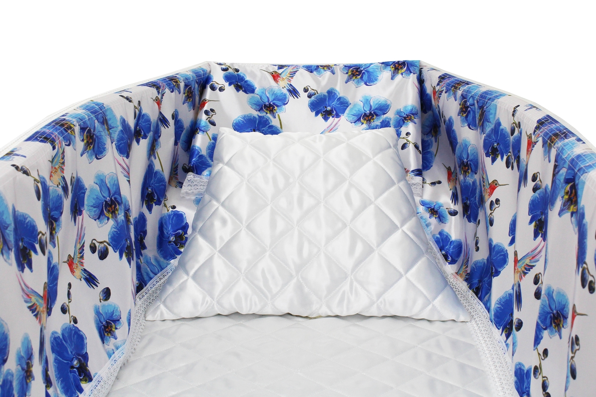 Luxury satin interior printed using water-based ink. The printed interior set consists of a 12-inch printed satin frill, printed satin facecloth, quilted satin pillow and a quilted satin mattress.