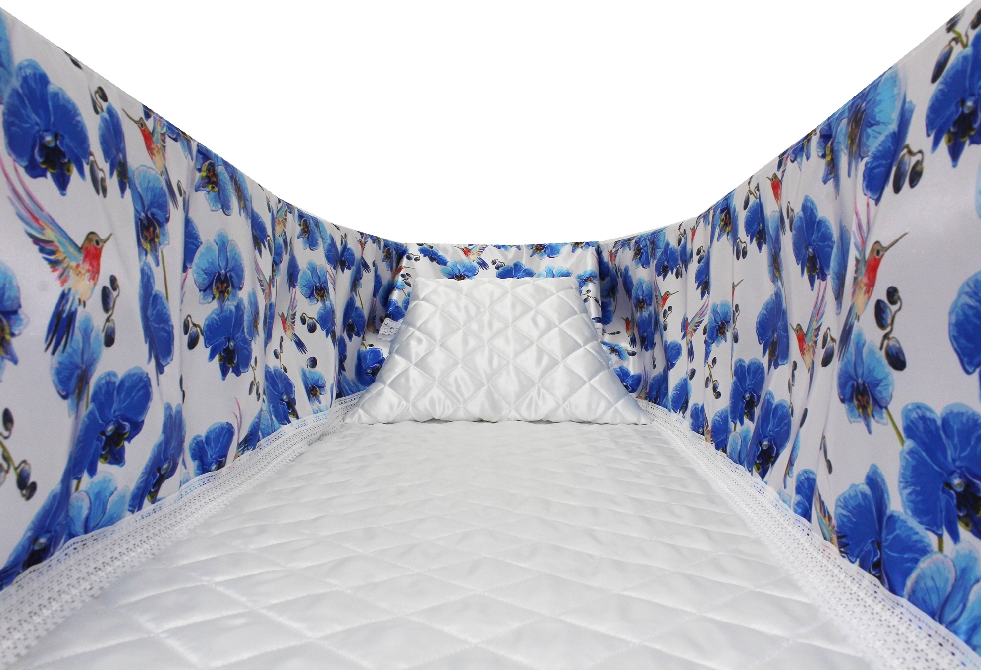 Luxury satin interior printed using water-based ink. The printed interior set consists of a 18-inch 2 Way printed satin frill, printed satin facecloth, quilted satin pillow and a quilted satin mattress.The chosen design will be printed on the interior. Image is to illustrate style of Interior Only.