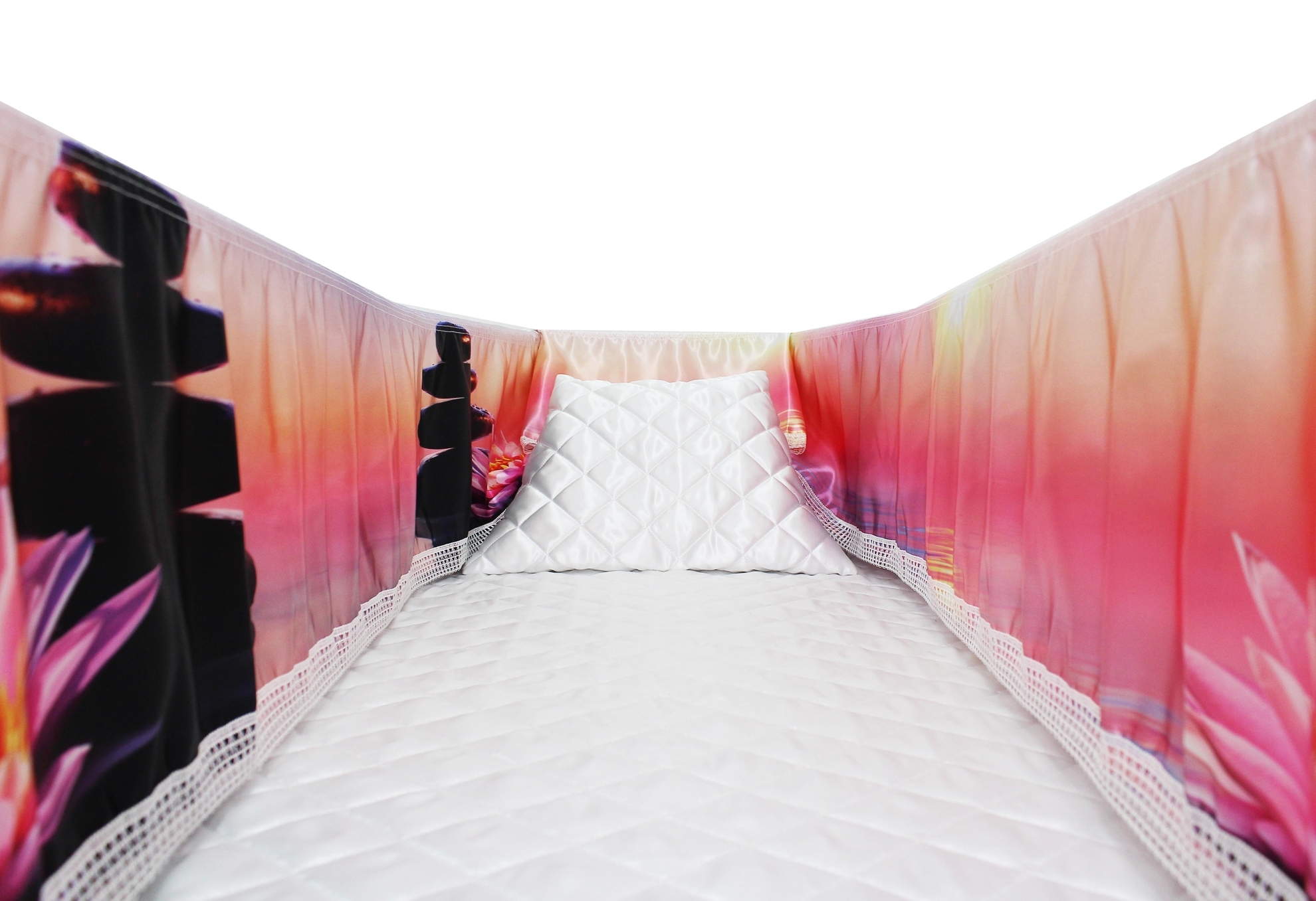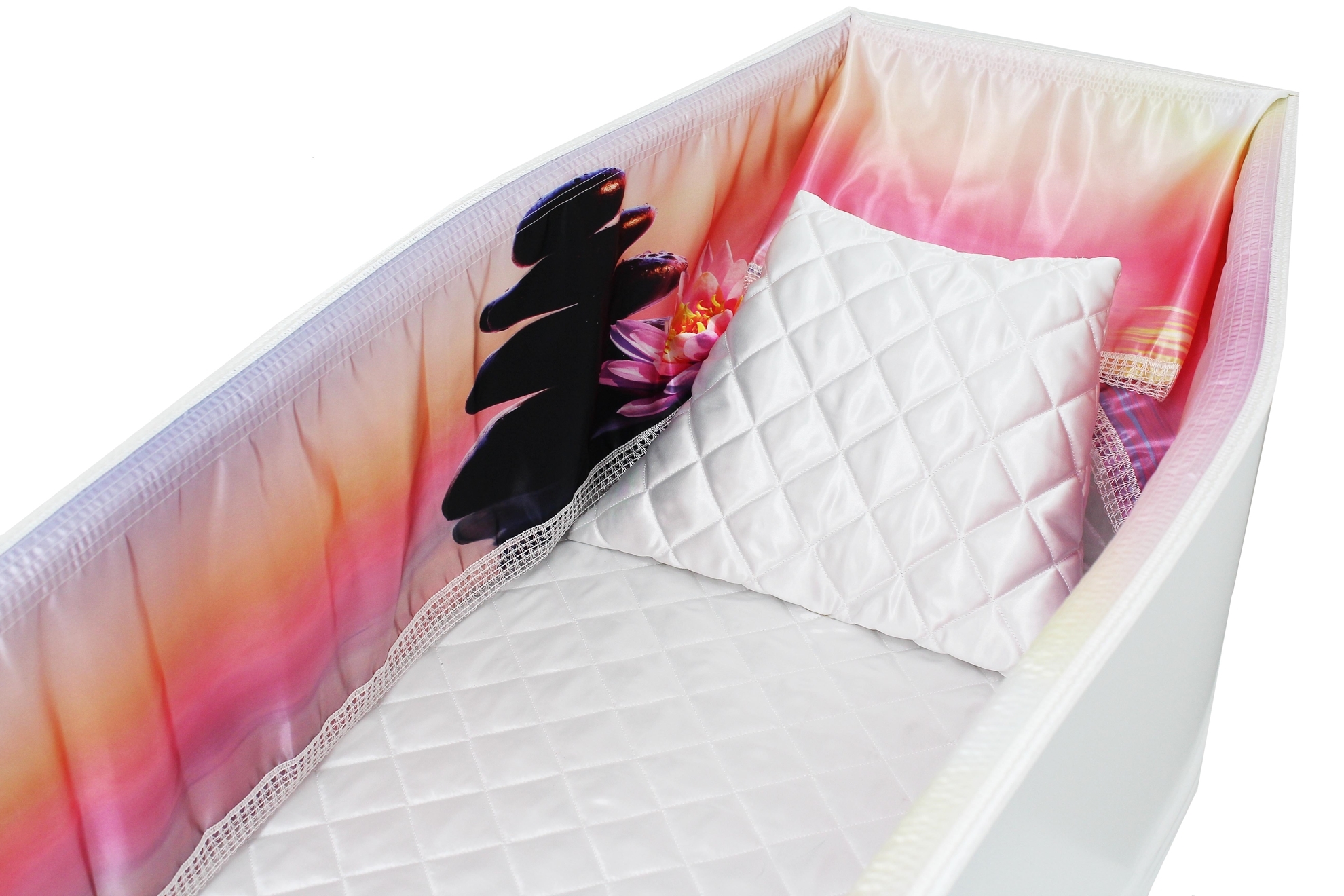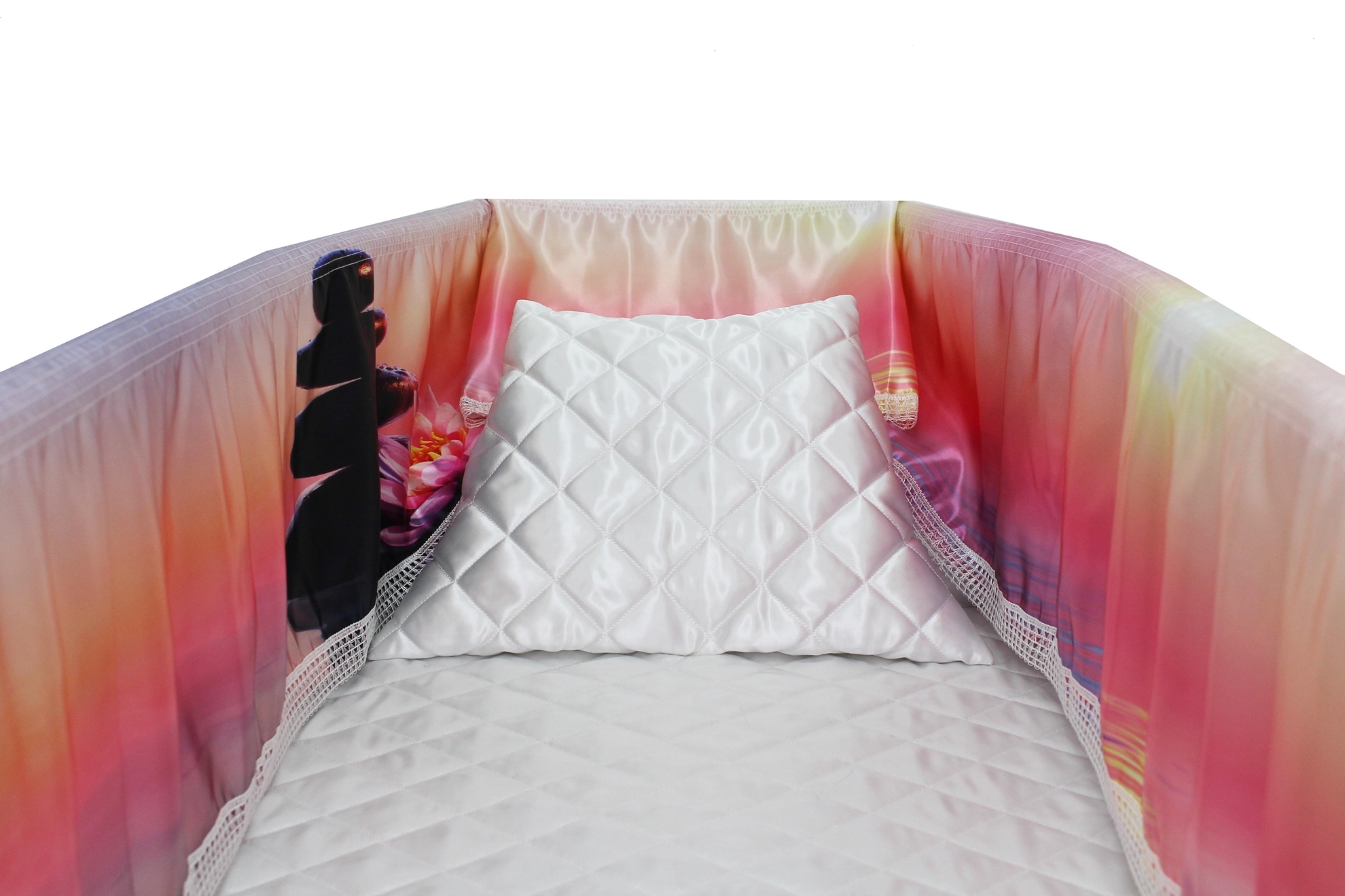 Luxury satin interior printed using water-based ink. The printed interior set consists of a 12-inch printed satin frill, printed satin facecloth, quilted satin pillow and a quilted satin mattress.
