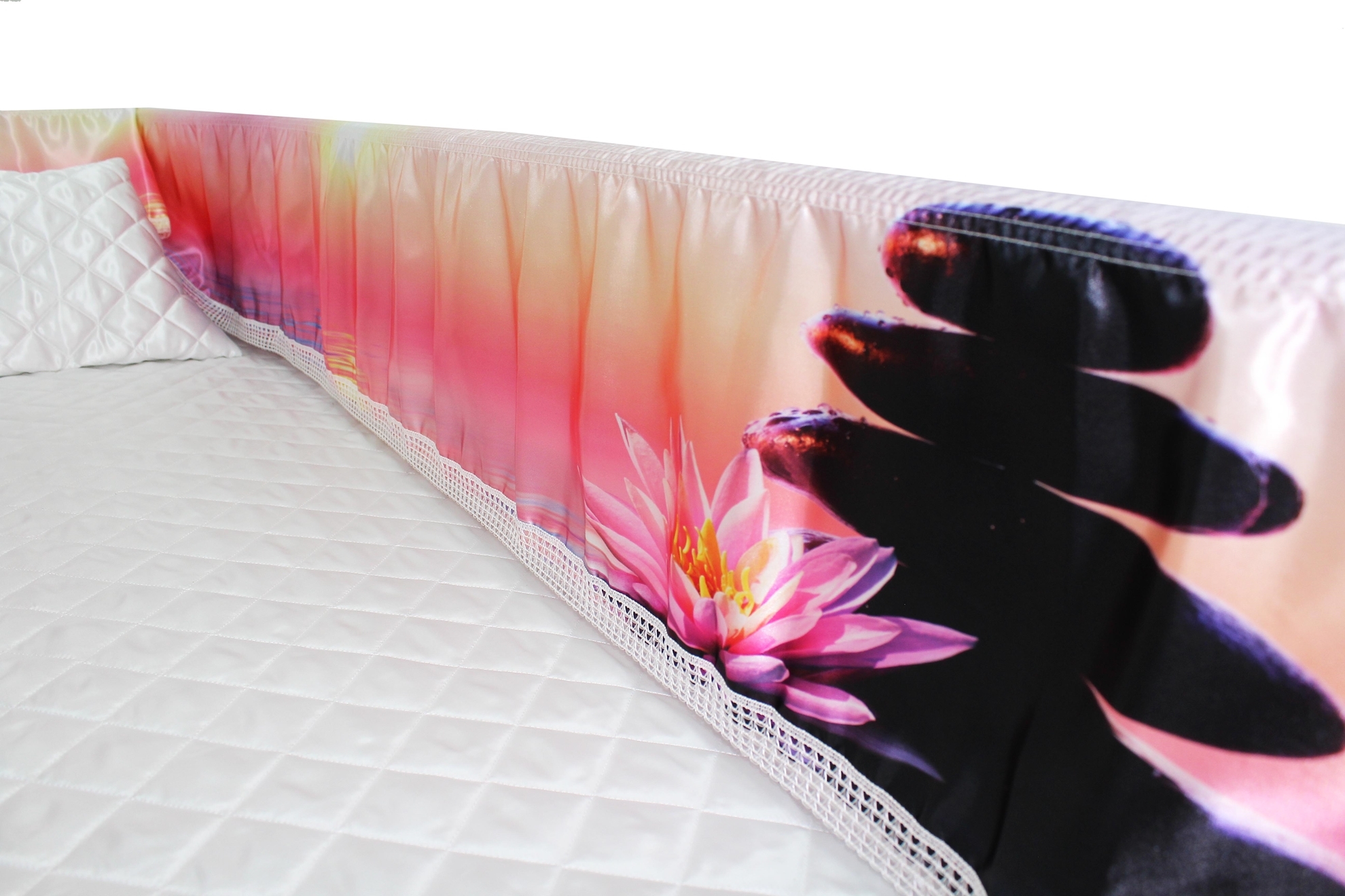 Luxury Satin 18-inch 2-way frill consisting of a 12-inch internal frill with an additional 6-inch exterior frill. The chosen design will be printed on the 18" 2-Way Frill. Please note the image shows a mattress and a pillow which are NOT included. Image is to illustrate style of Interior Only.