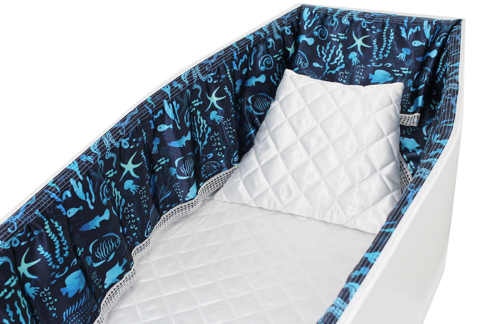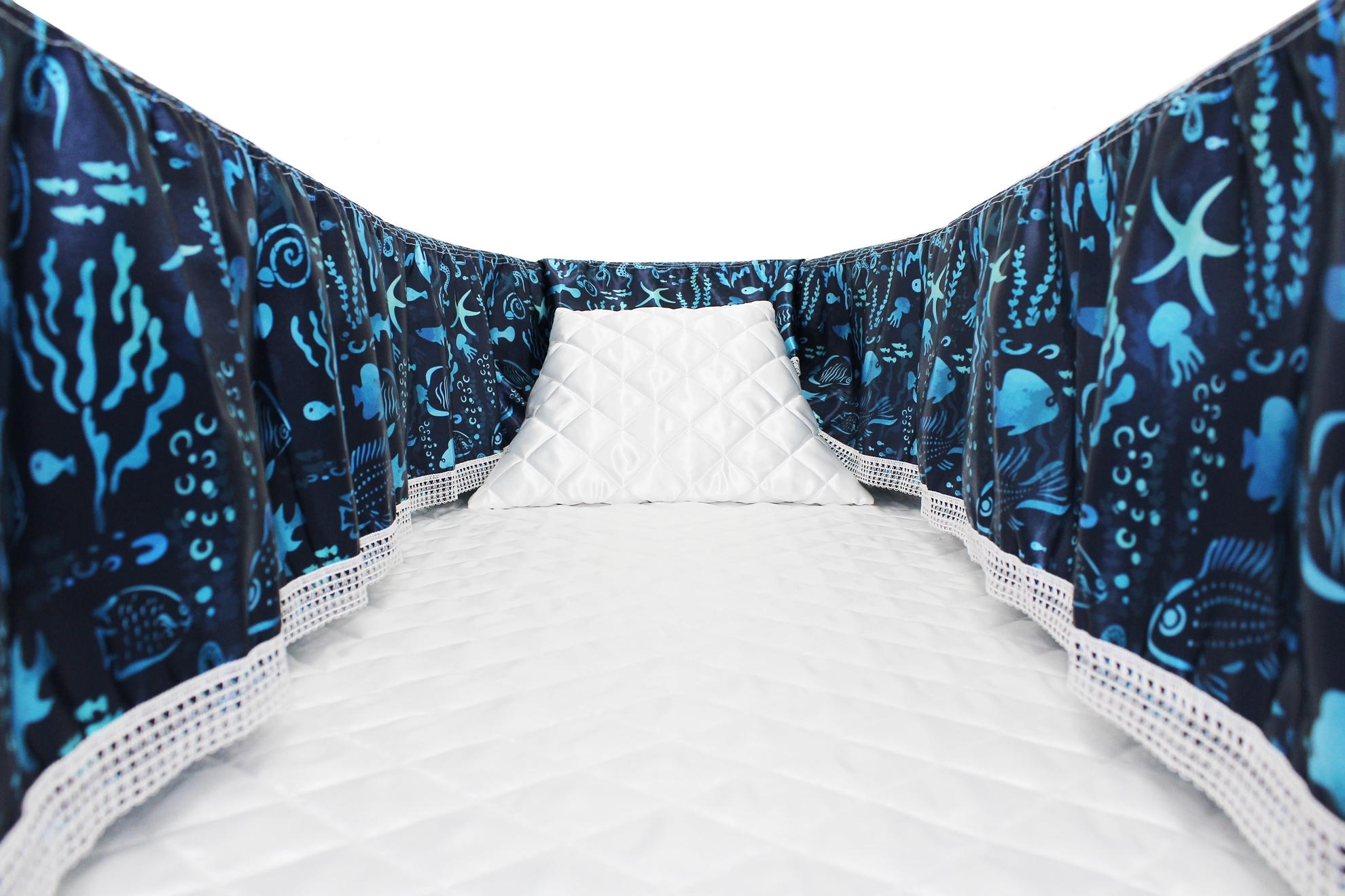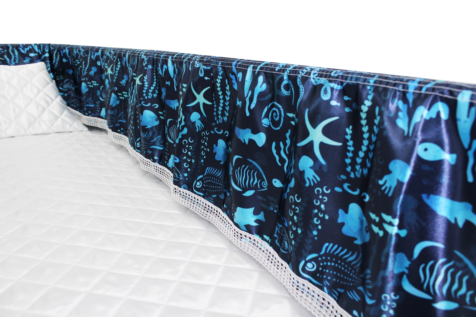 Luxury Satin 18-inch 2-way frill consisting of a 12-inch internal frill with an additional 6-inch exterior frill. The chosen design will be printed on the 18" 2-Way Frill. Please note the image shows a mattress and a pillow which are NOT included. Image is to illustrate style of Interior Only.