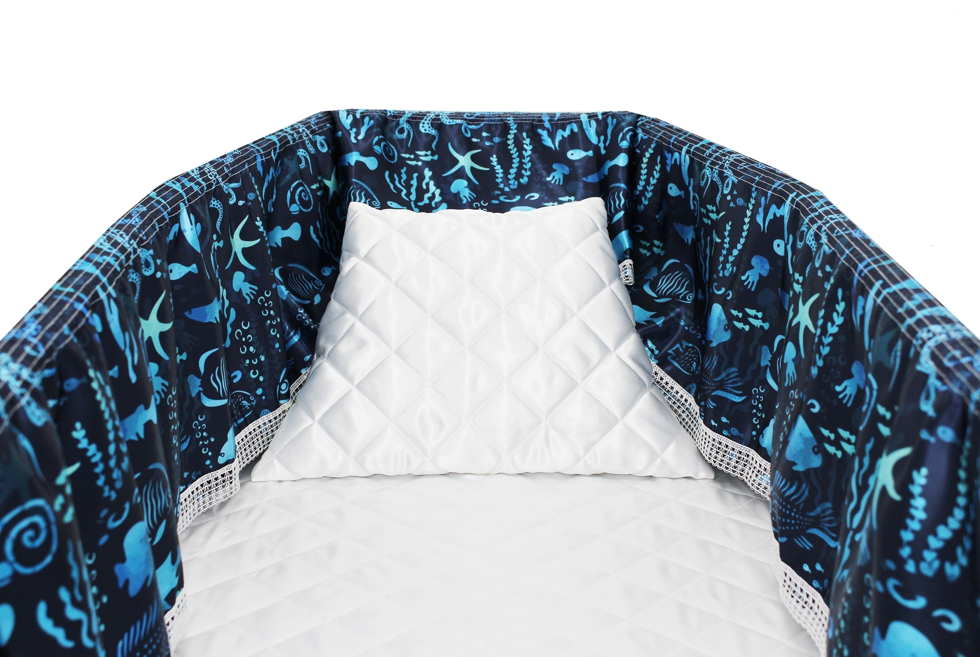 Luxury satin interior printed using water-based ink. The printed interior set consists of a 12-inch printed satin frill, printed satin facecloth, quilted satin pillow and a quilted satin mattress.