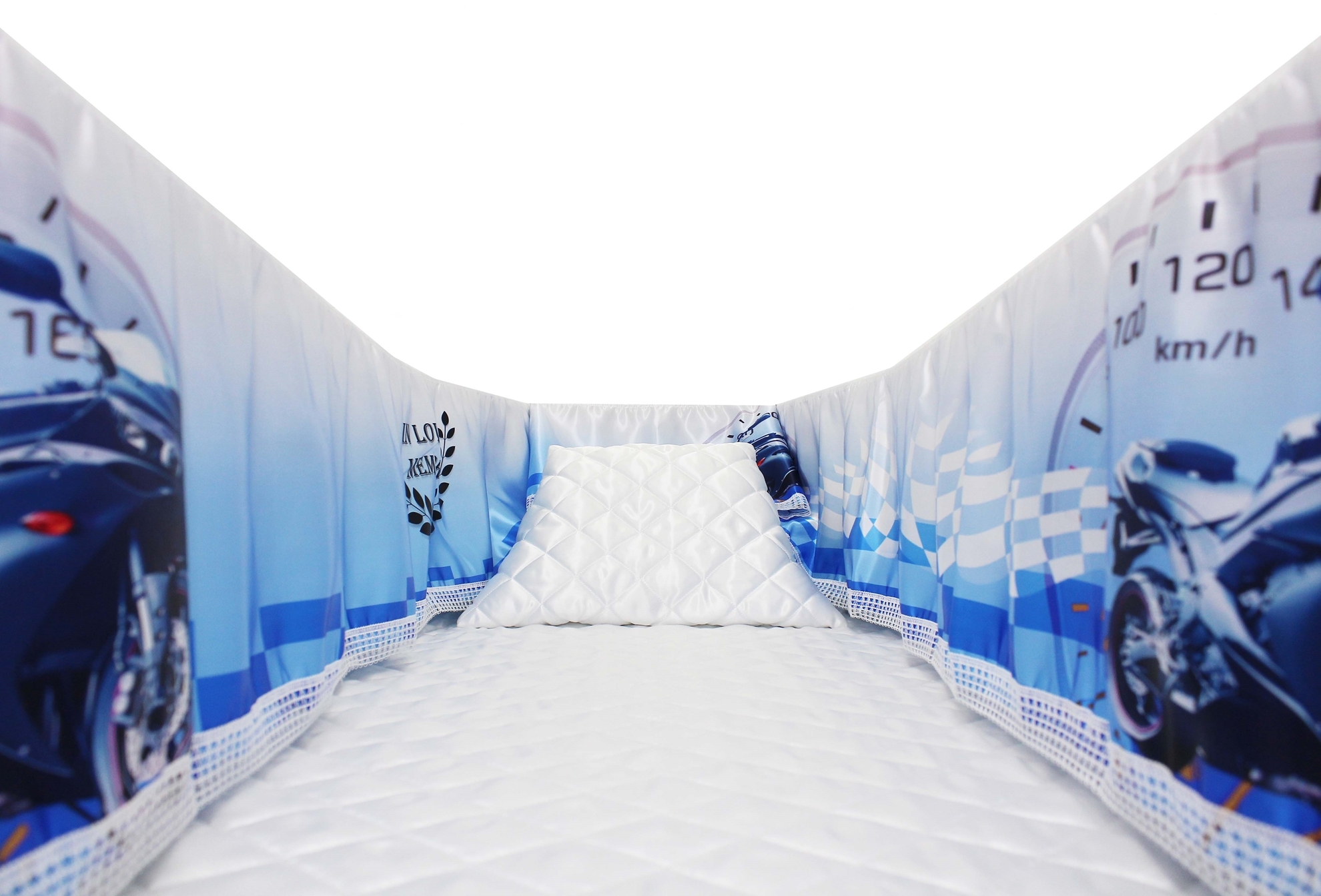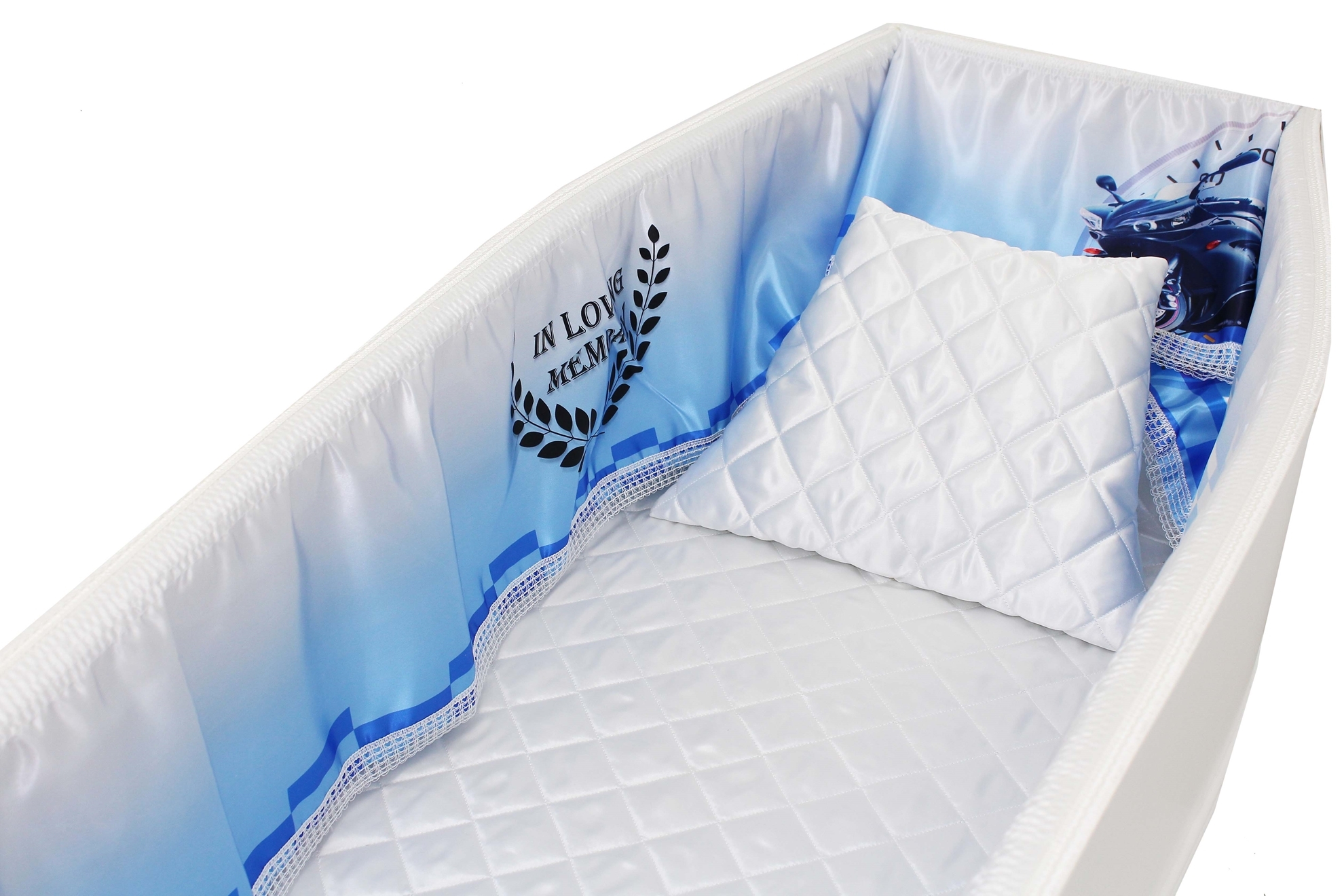 Luxury satin interior printed using water-based ink. The printed interior set consists of a 18-inch 2 Way printed satin frill, printed satin facecloth, quilted satin pillow and a quilted satin mattress.The chosen design will be printed on the interior. Image is to illustrate style of Interior Only.