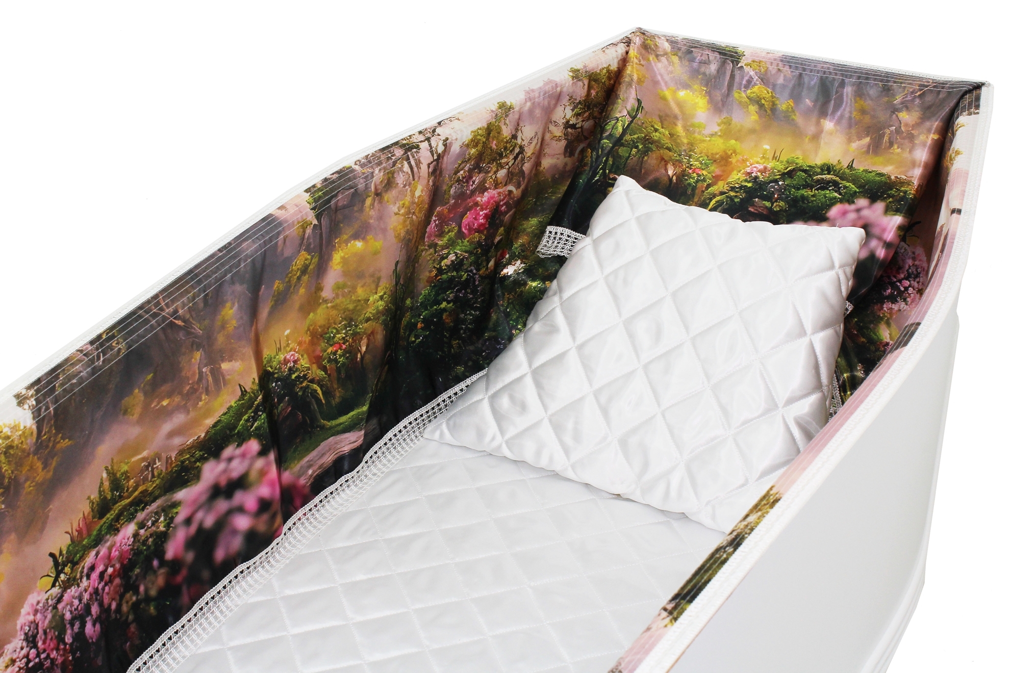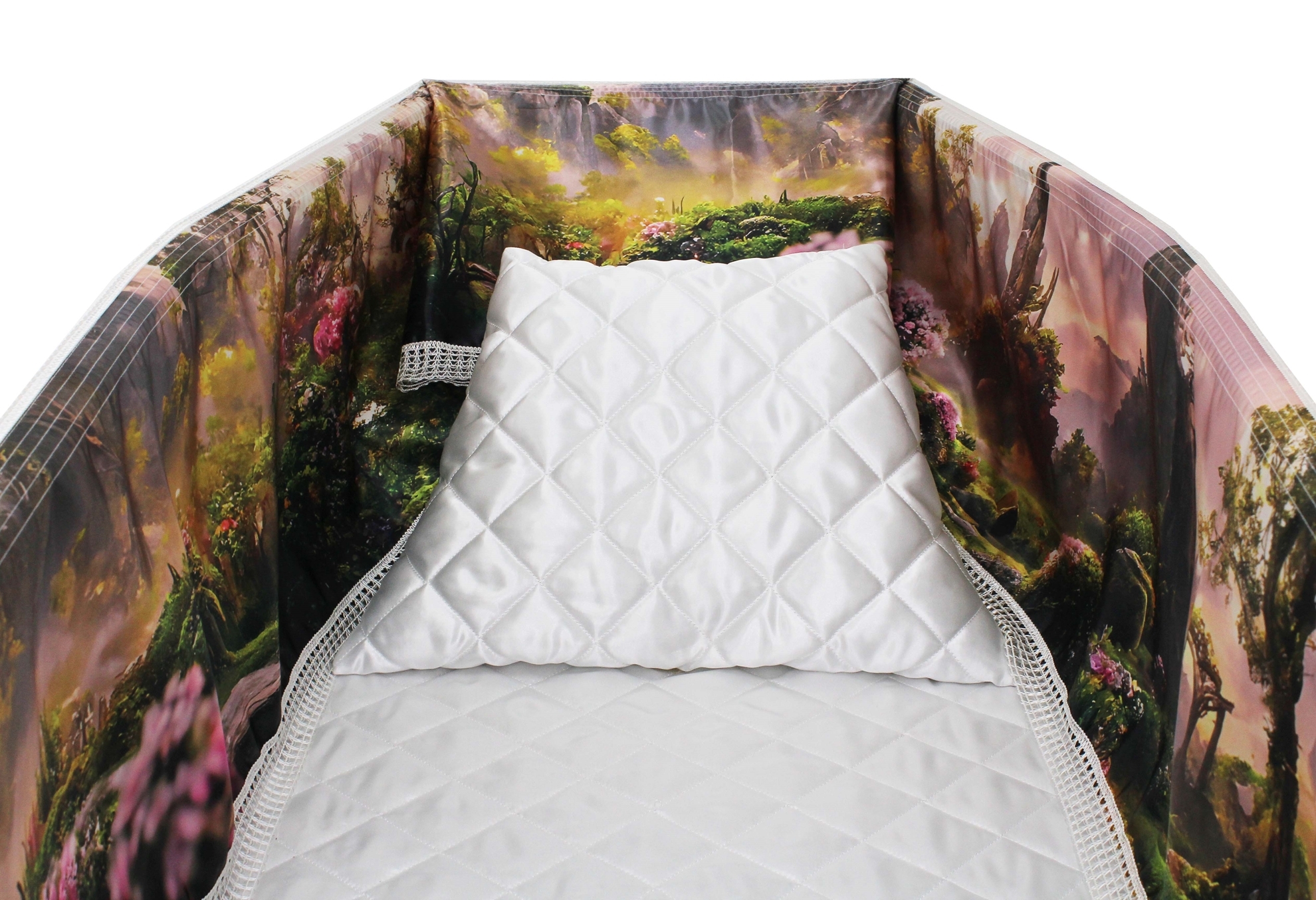 Luxury satin interior printed using water-based ink. The printed interior set consists of a 18-inch 2 Way printed satin frill, printed satin facecloth, quilted satin pillow and a quilted satin mattress.The chosen design will be printed on the interior. Image is to illustrate style of Interior Only.