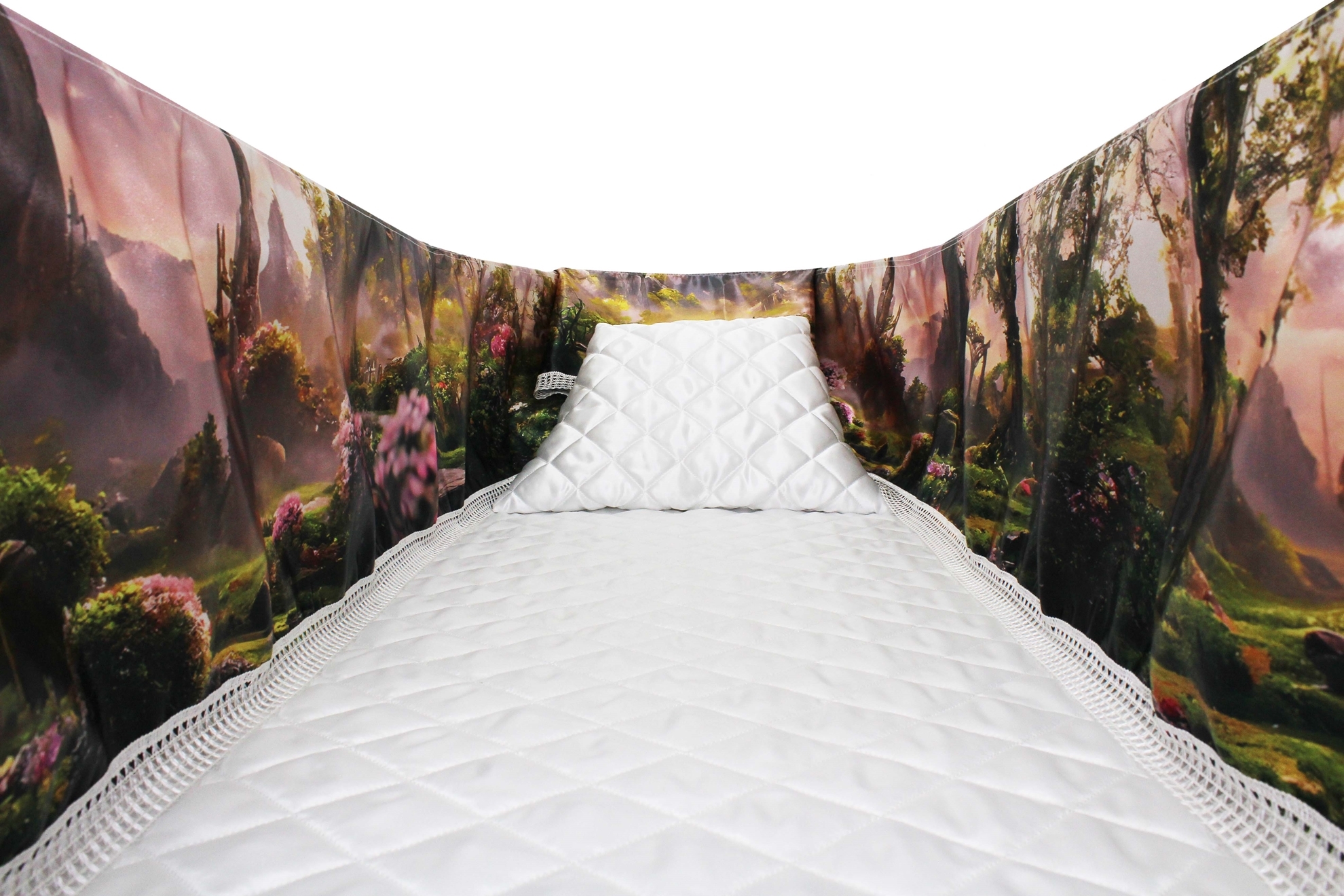 Luxury satin interior printed using water-based ink. The printed interior set consists of a 12-inch printed satin frill, printed satin facecloth, quilted satin pillow and a quilted satin mattress.
