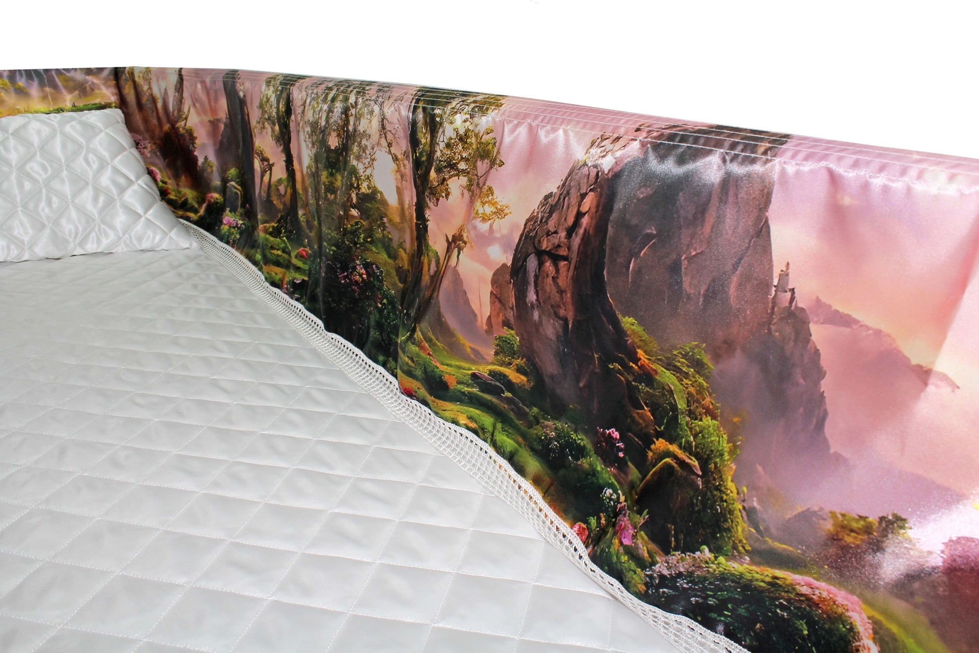 Luxury Satin 18-inch 2-way frill consisting of a 12-inch internal frill with an additional 6-inch exterior frill. The chosen design will be printed on the 18" 2-Way Frill. Please note the image shows a mattress and a pillow which are NOT included. Image is to illustrate style of Interior Only.