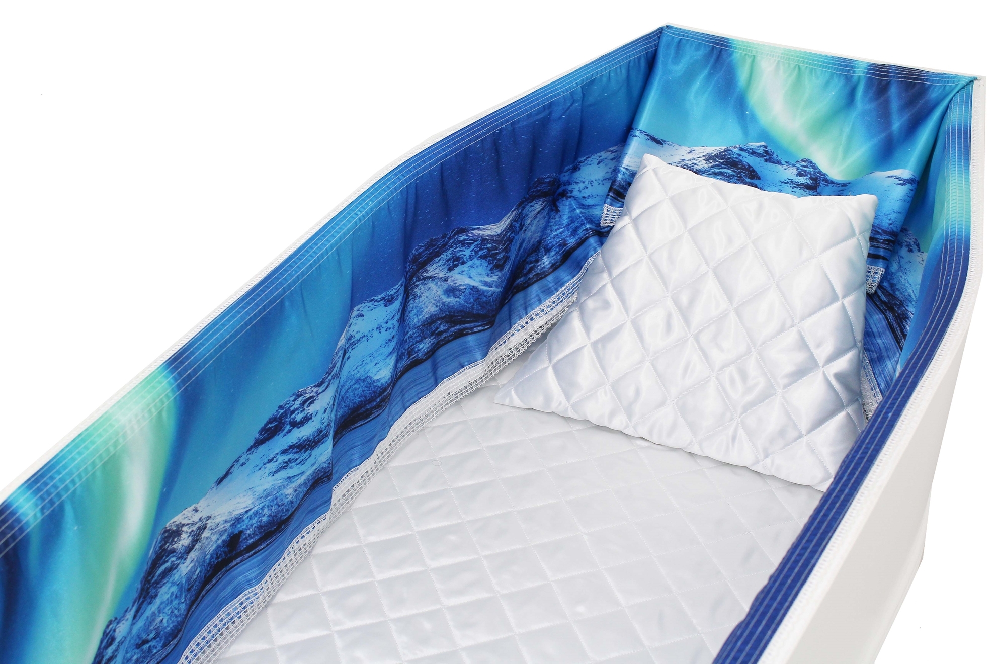 Luxury satin interior printed using water-based ink. The printed interior set consists of a 18-inch 2 Way printed satin frill, printed satin facecloth, quilted satin pillow and a quilted satin mattress.The chosen design will be printed on the interior. Image is to illustrate style of Interior Only.