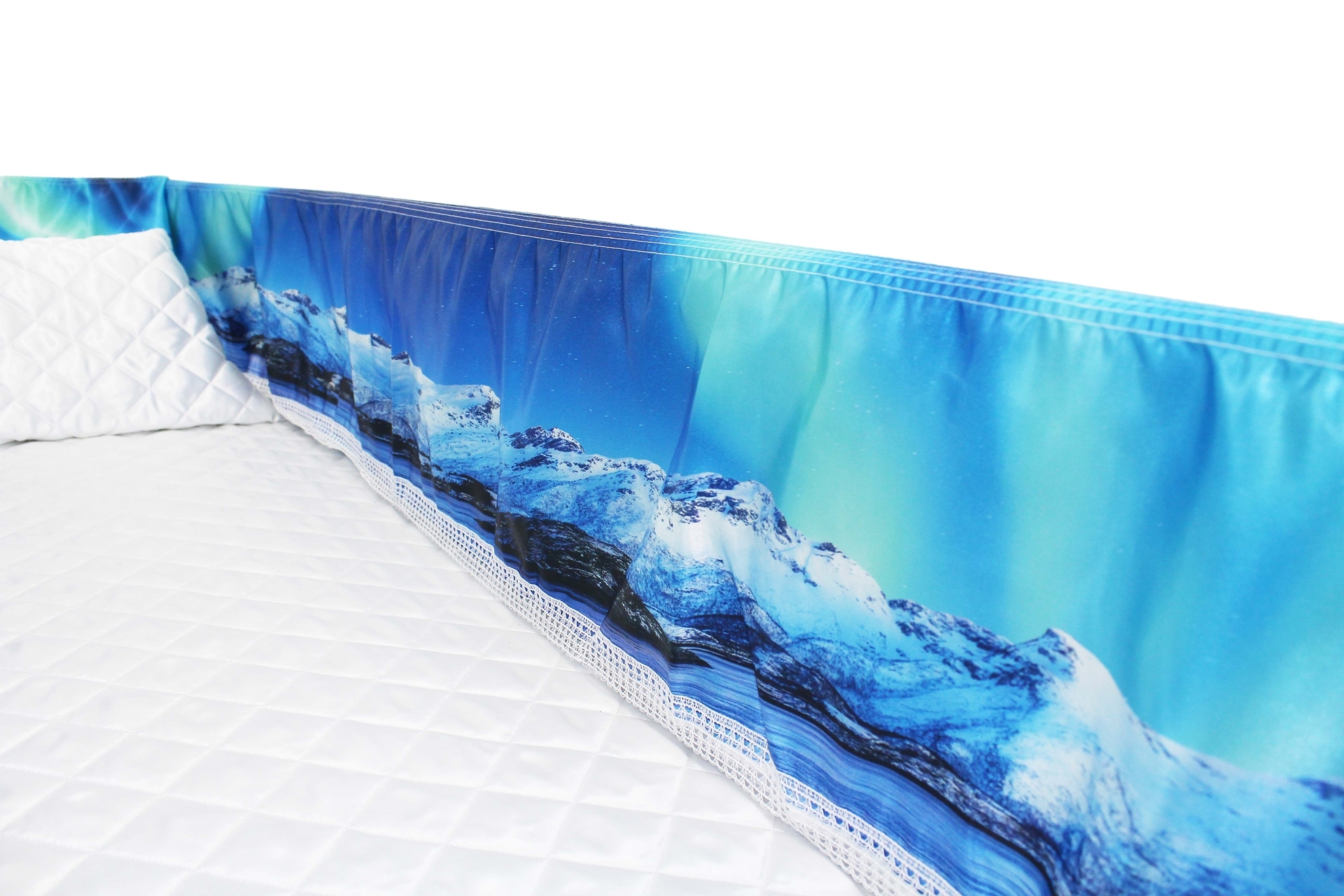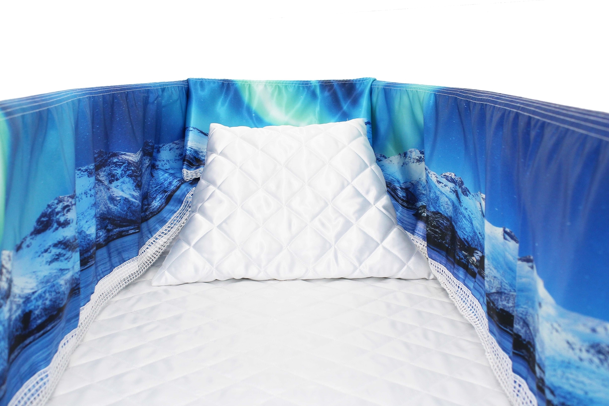 Luxury Satin 18-inch 2-way frill consisting of a 12-inch internal frill with an additional 6-inch exterior frill. The chosen design will be printed on the 18" 2-Way Frill. Please note the image shows a mattress and a pillow which are NOT included. Image is to illustrate style of Interior Only.