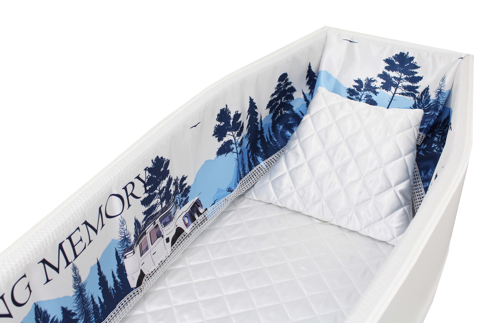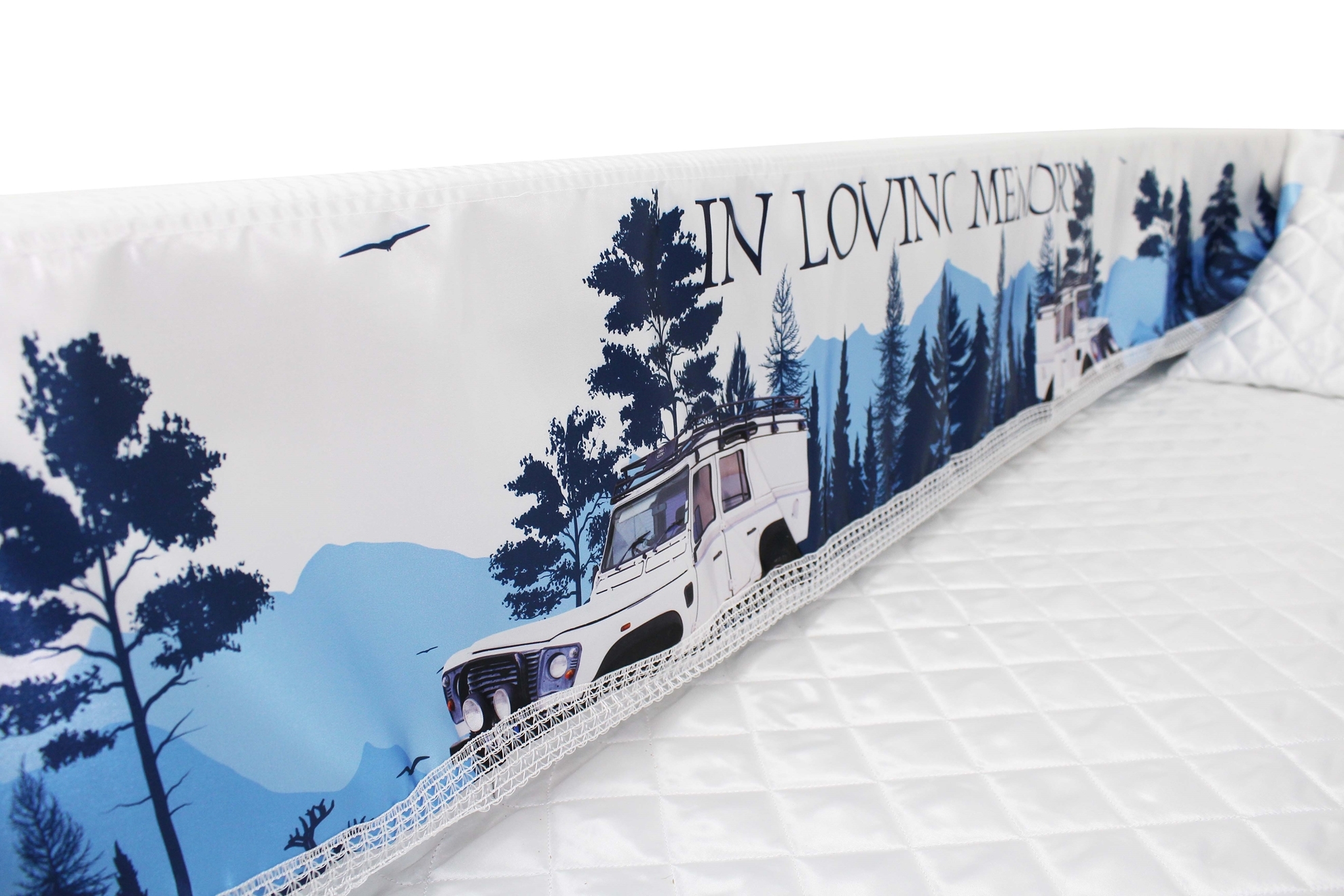 Luxury satin interior printed using water-based ink. The printed interior set consists of a 18-inch 2 Way printed satin frill, printed satin facecloth, quilted satin pillow and a quilted satin mattress.The chosen design will be printed on the interior. Image is to illustrate style of Interior Only.