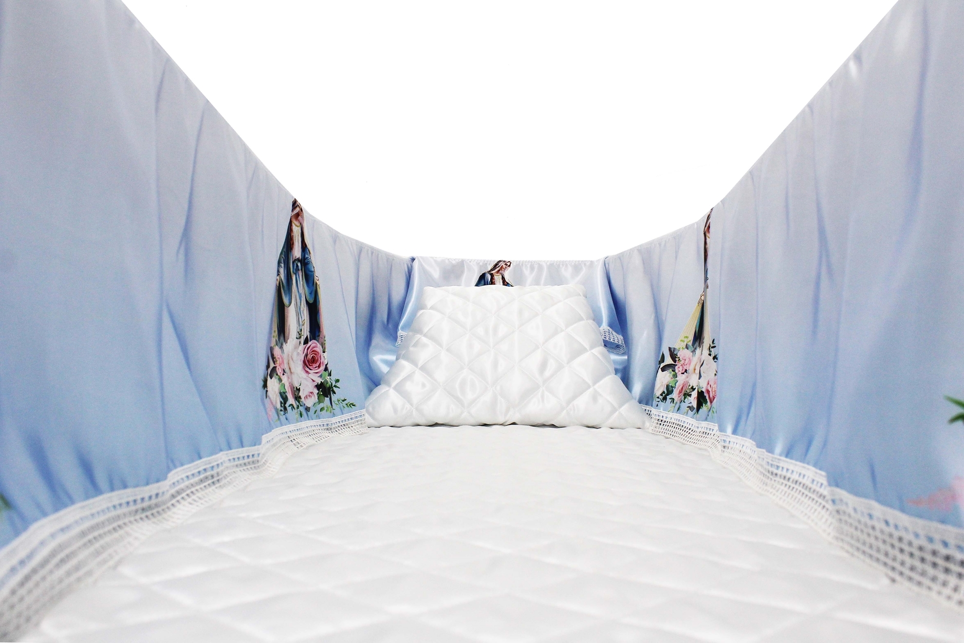 Luxury satin interior printed using water-based ink. The printed interior set consists of a 12-inch printed satin frill, printed satin facecloth, quilted satin pillow and a quilted satin mattress.
