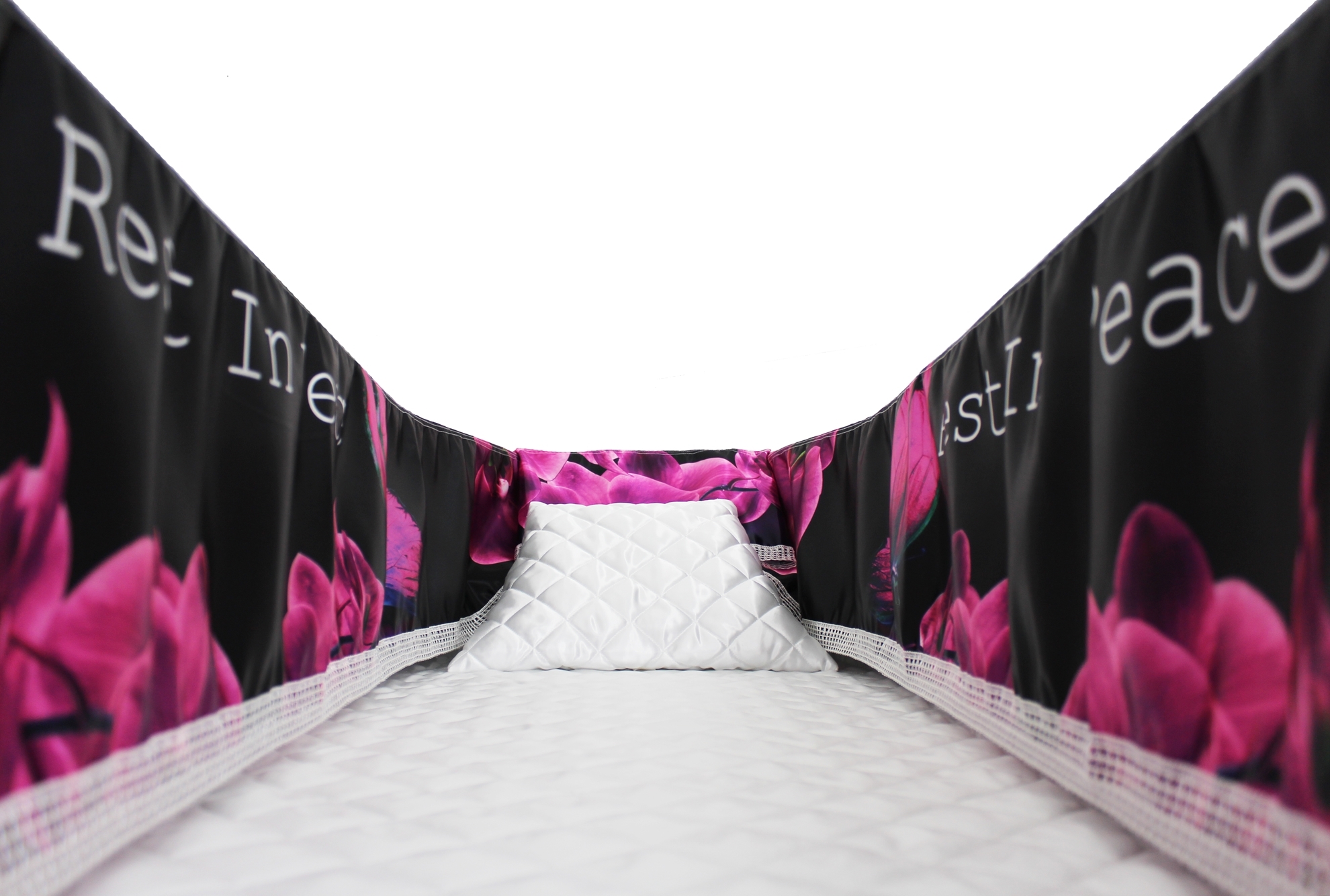 Luxury satin interior printed using water-based ink. The printed interior set consists of a 12-inch printed satin frill, printed satin facecloth, quilted satin pillow and a quilted satin mattress.