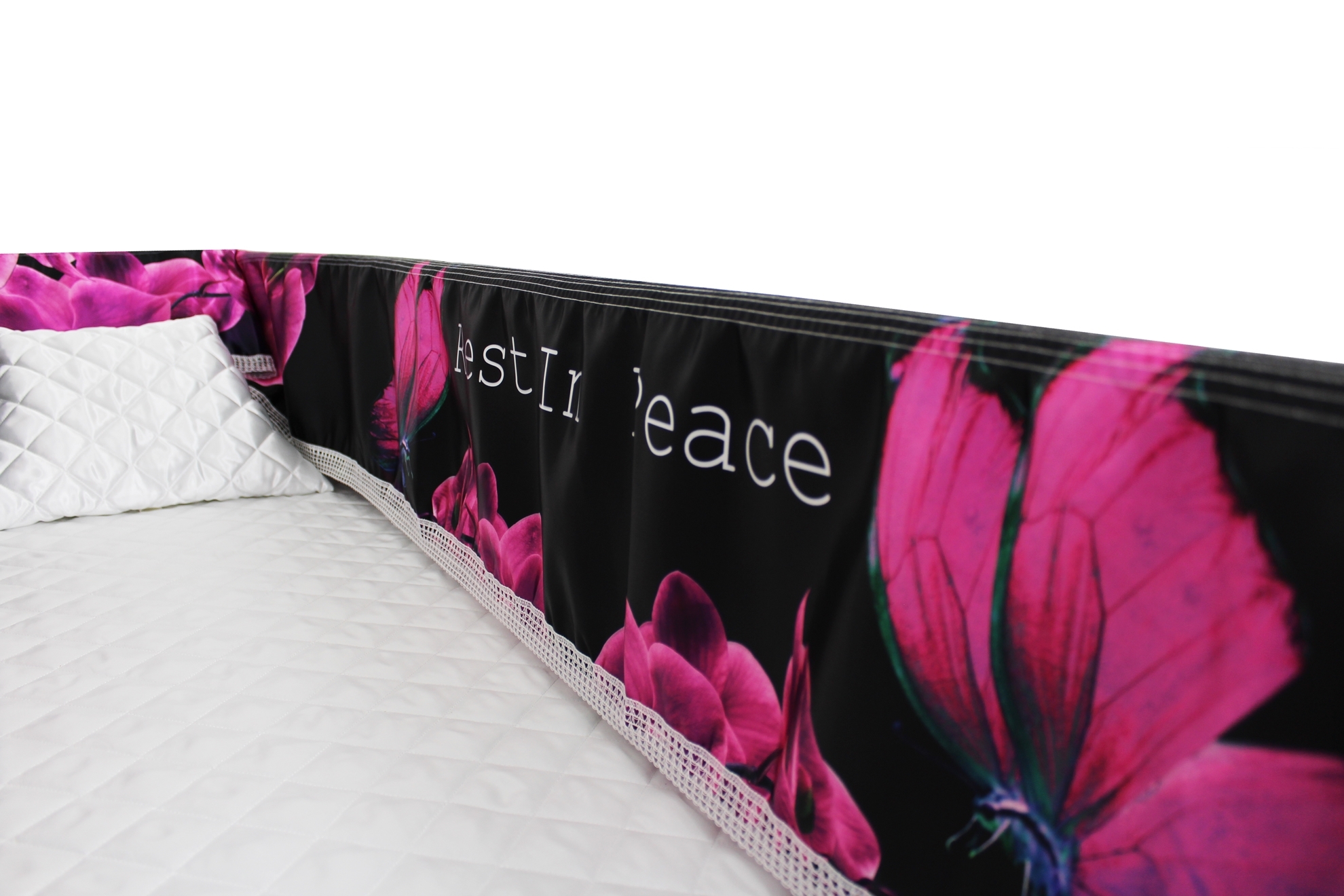 Luxury Satin 18-inch 2-way frill consisting of a 12-inch internal frill with an additional 6-inch exterior frill. The chosen design will be printed on the 18" 2-Way Frill. Please note the image shows a mattress and a pillow which are NOT included. Image is to illustrate style of Interior Only.