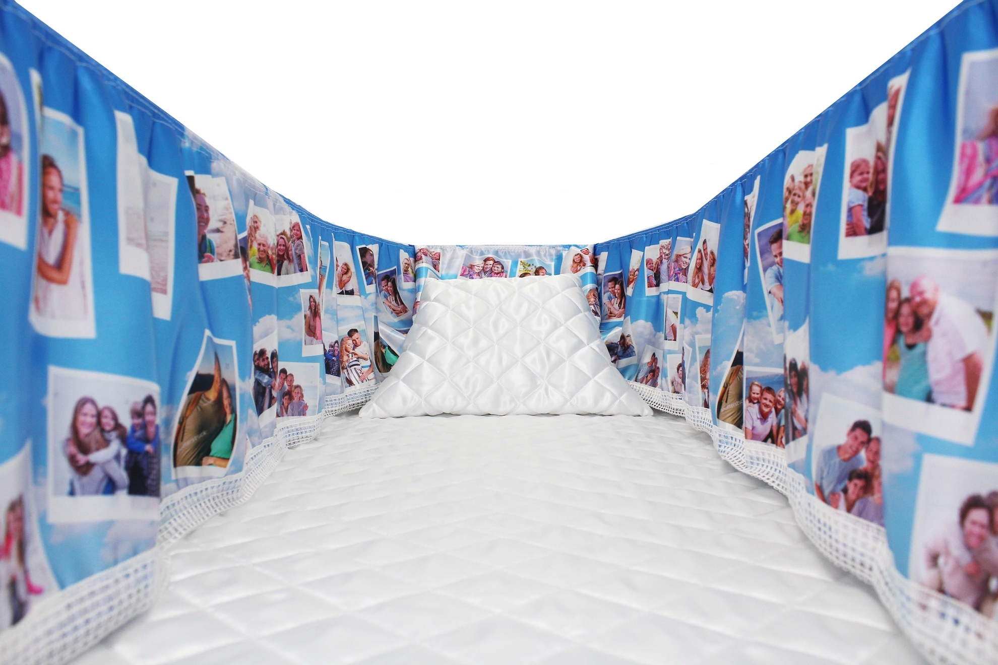 Luxury satin interior printed using water-based ink. The printed interior set consists of a 12-inch printed satin frill, printed satin facecloth, quilted satin pillow and a quilted satin mattress.