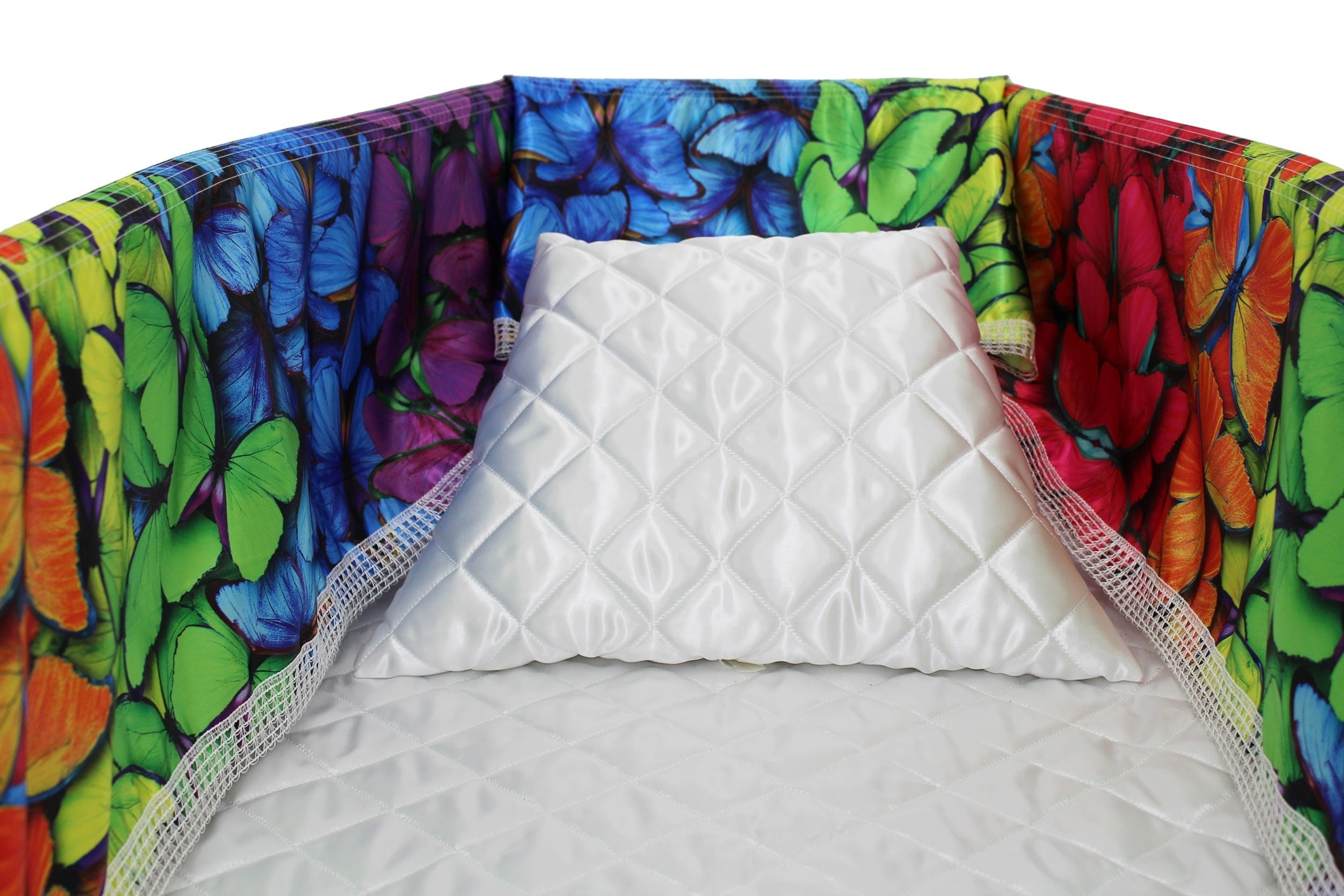 Luxury satin interior printed using water-based ink. The printed interior set consists of a 12-inch printed satin frill, printed satin facecloth, quilted satin pillow and a quilted satin mattress.