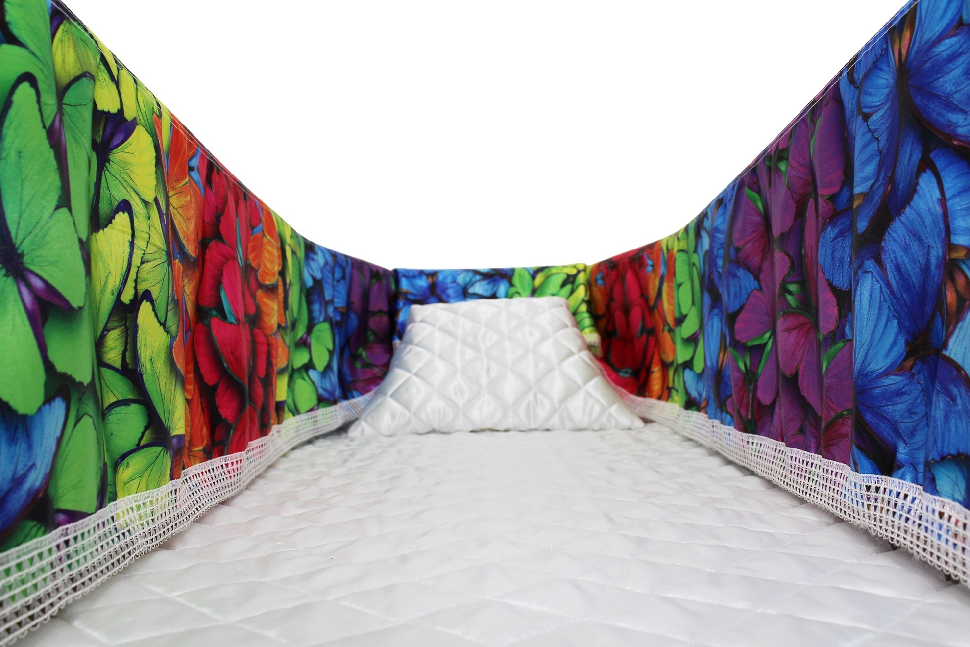 Luxury satin interior printed using water-based ink. The printed interior set consists of a 18-inch 2 Way printed satin frill, printed satin facecloth, quilted satin pillow and a quilted satin mattress.The chosen design will be printed on the interior. Image is to illustrate style of Interior Only.