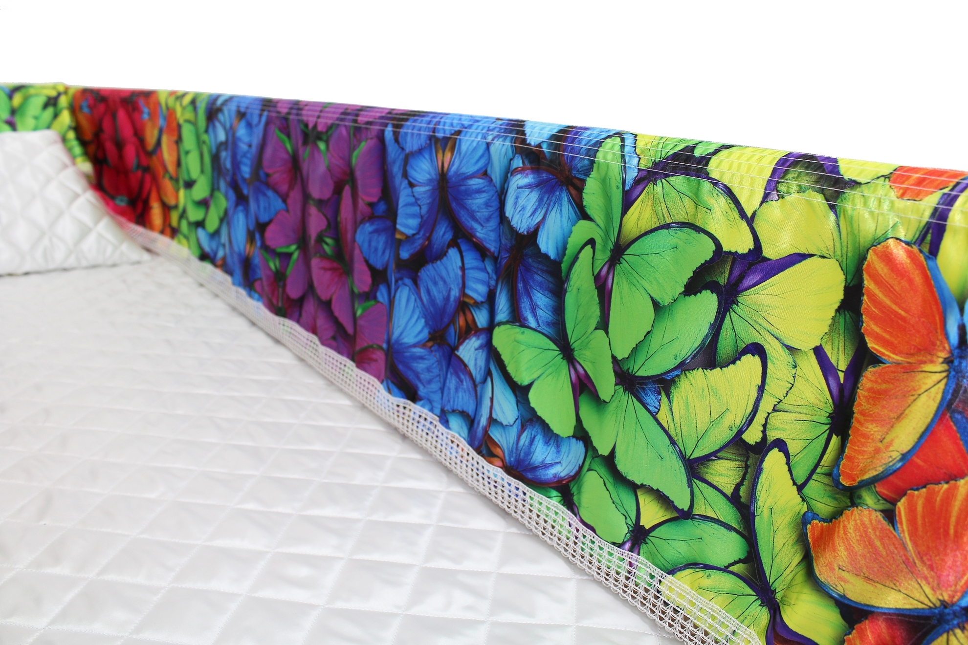 Luxury Satin 18-inch 2-way frill consisting of a 12-inch internal frill with an additional 6-inch exterior frill. The chosen design will be printed on the 18" 2-Way Frill. Please note the image shows a mattress and a pillow which are NOT included. Image is to illustrate style of Interior Only.
