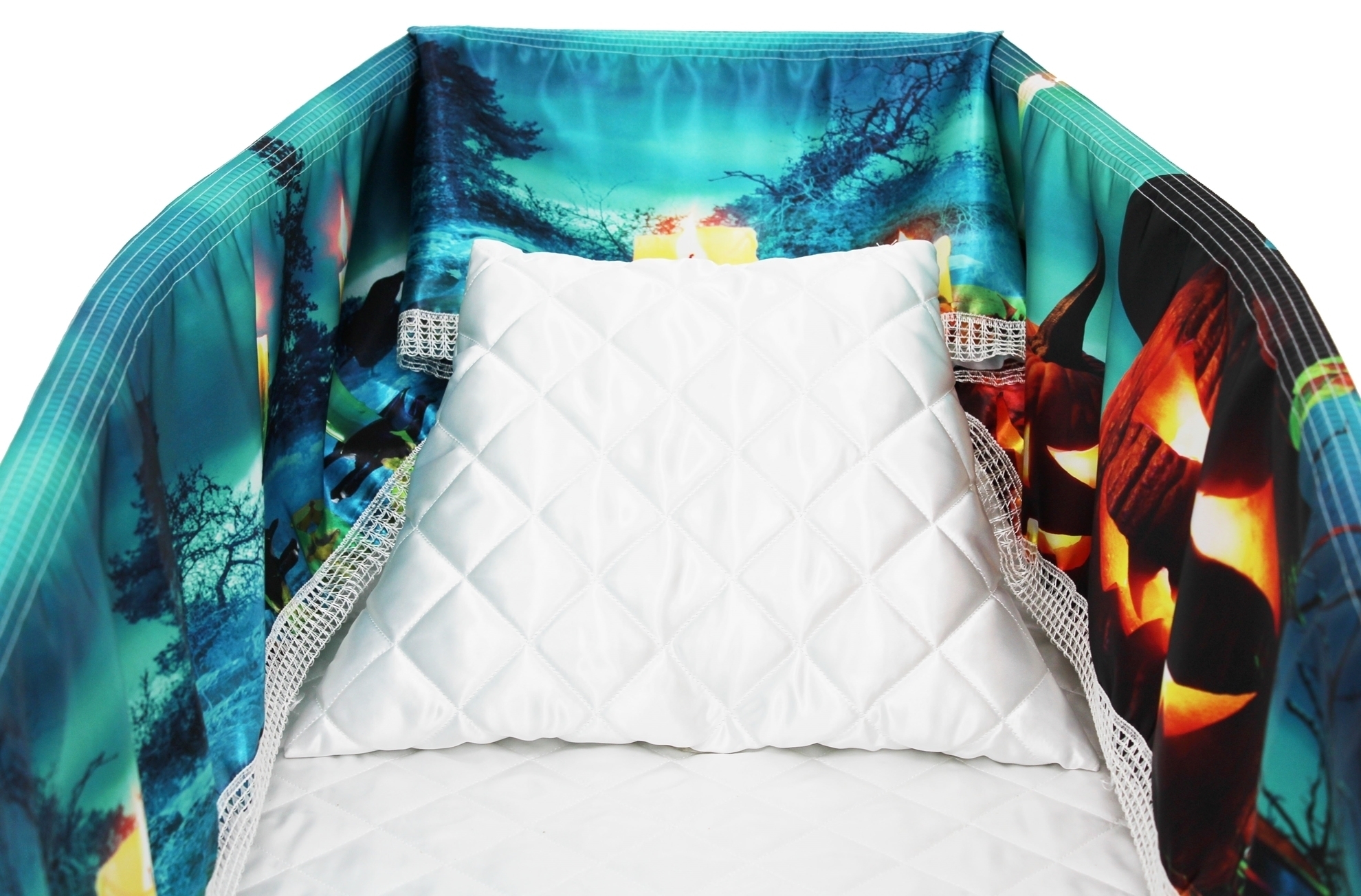Luxury satin interior printed using water-based ink. The printed interior set consists of a 12-inch printed satin frill, printed satin facecloth, quilted satin pillow and a quilted satin mattress.