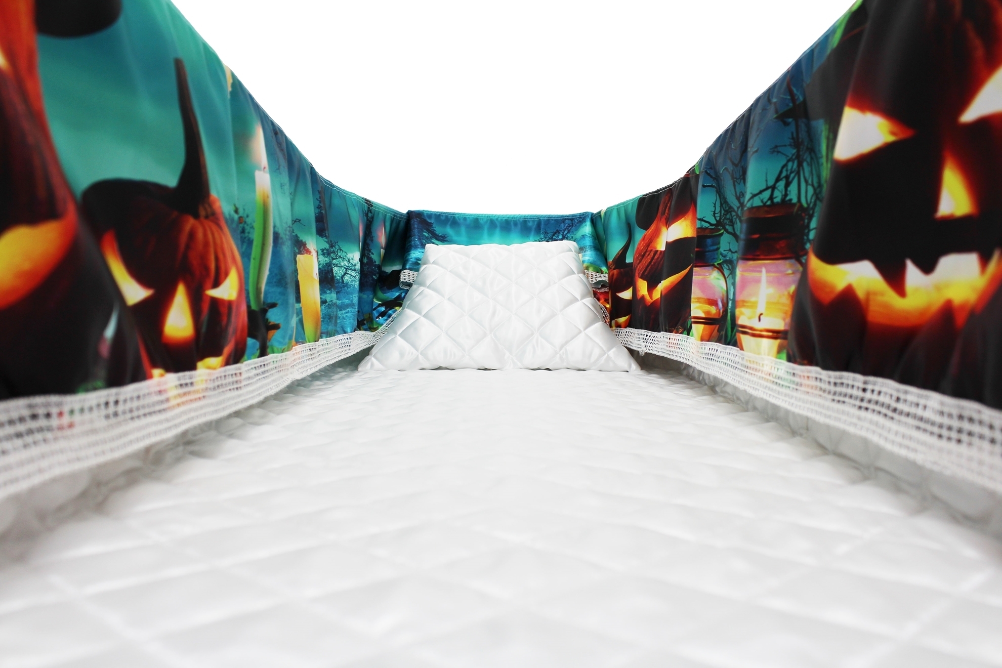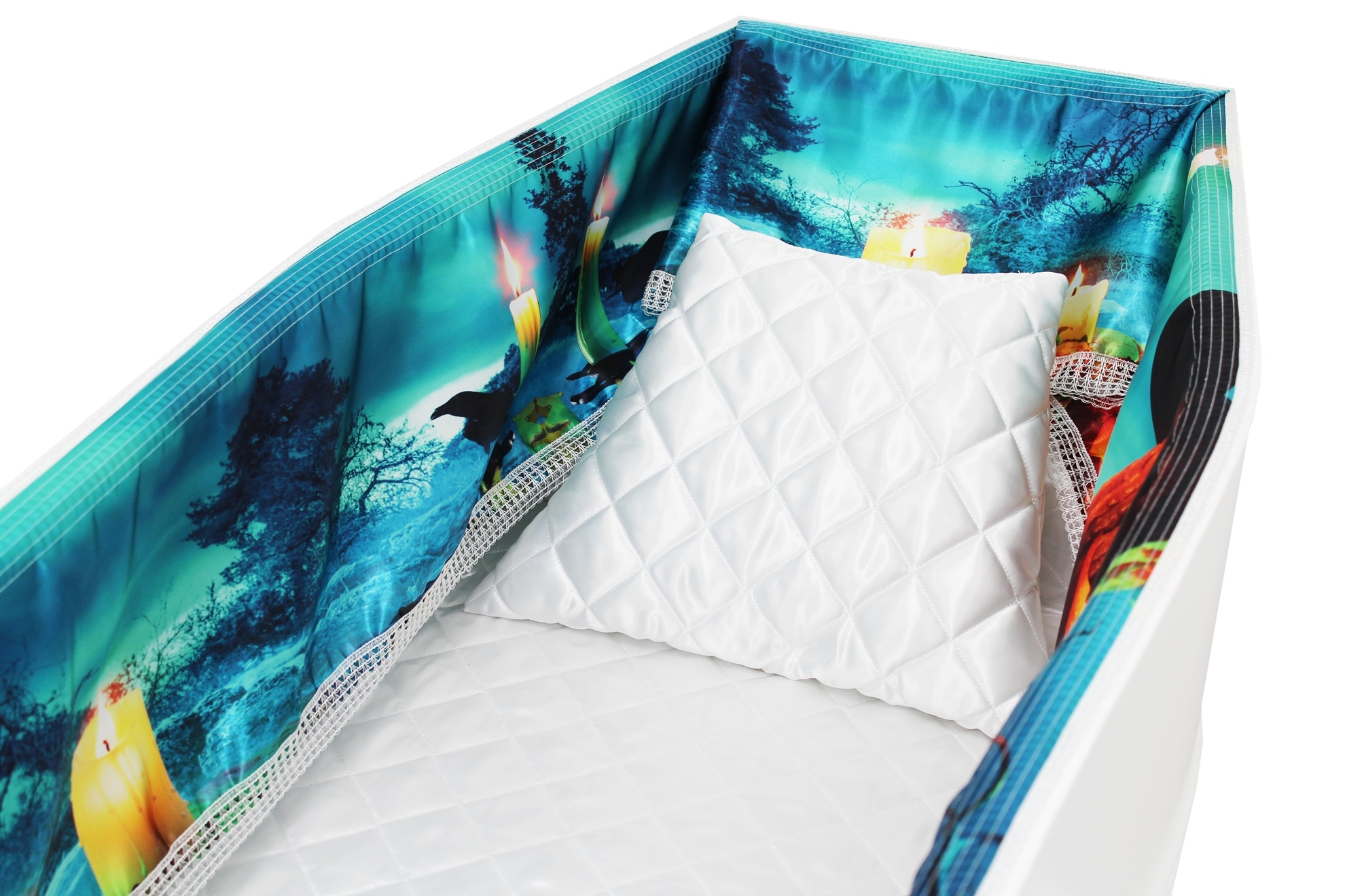 Luxury satin interior printed using water-based ink. The printed interior set consists of a 18-inch 2 Way printed satin frill, printed satin facecloth, quilted satin pillow and a quilted satin mattress.The chosen design will be printed on the interior. Image is to illustrate style of Interior Only.