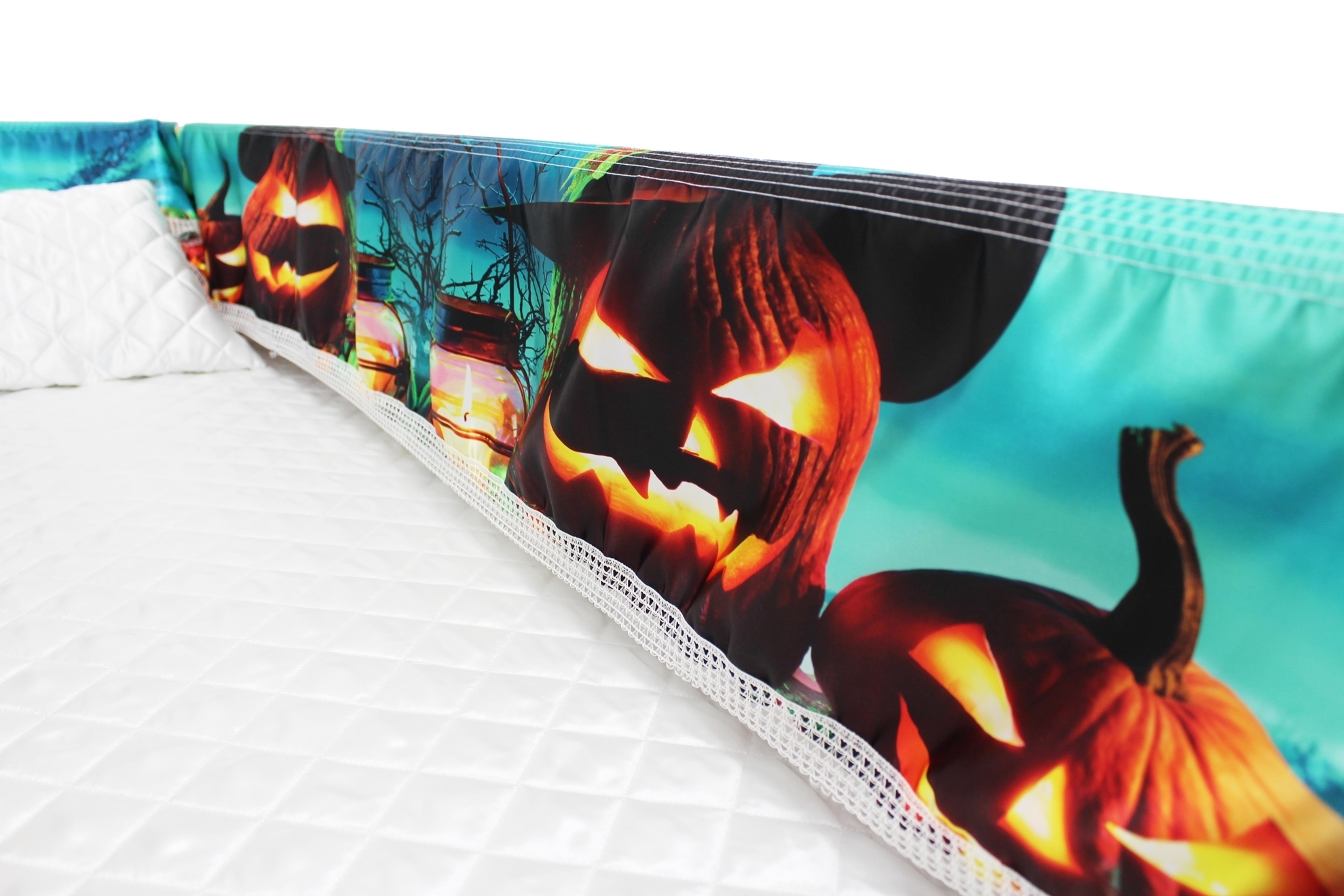 Luxury Satin 18-inch 2-way frill consisting of a 12-inch internal frill with an additional 6-inch exterior frill. The chosen design will be printed on the 18" 2-Way Frill. Please note the image shows a mattress and a pillow which are NOT included. Image is to illustrate style of Interior Only.