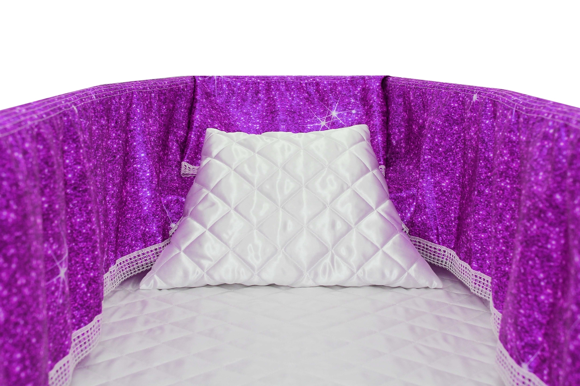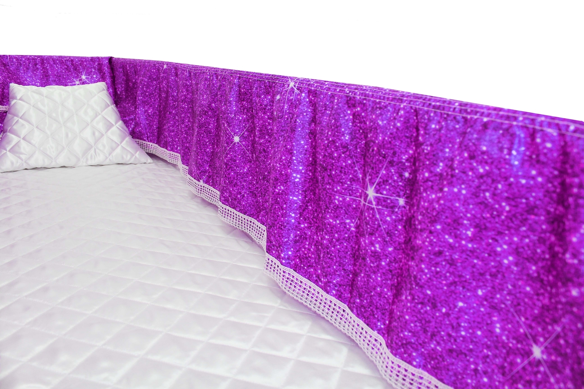 Luxury Satin 18-inch 2-way frill consisting of a 12-inch internal frill with an additional 6-inch exterior frill. The chosen design will be printed on the 18" 2-Way Frill. Please note the image shows a mattress and a pillow which are NOT included. Image is to illustrate style of Interior Only.