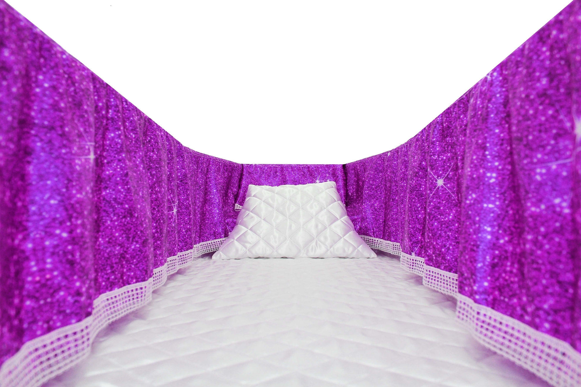 Luxury satin interior printed using water-based ink. The printed interior set consists of a 18-inch 2 Way printed satin frill, printed satin facecloth, quilted satin pillow and a quilted satin mattress.The chosen design will be printed on the interior. Image is to illustrate style of Interior Only.