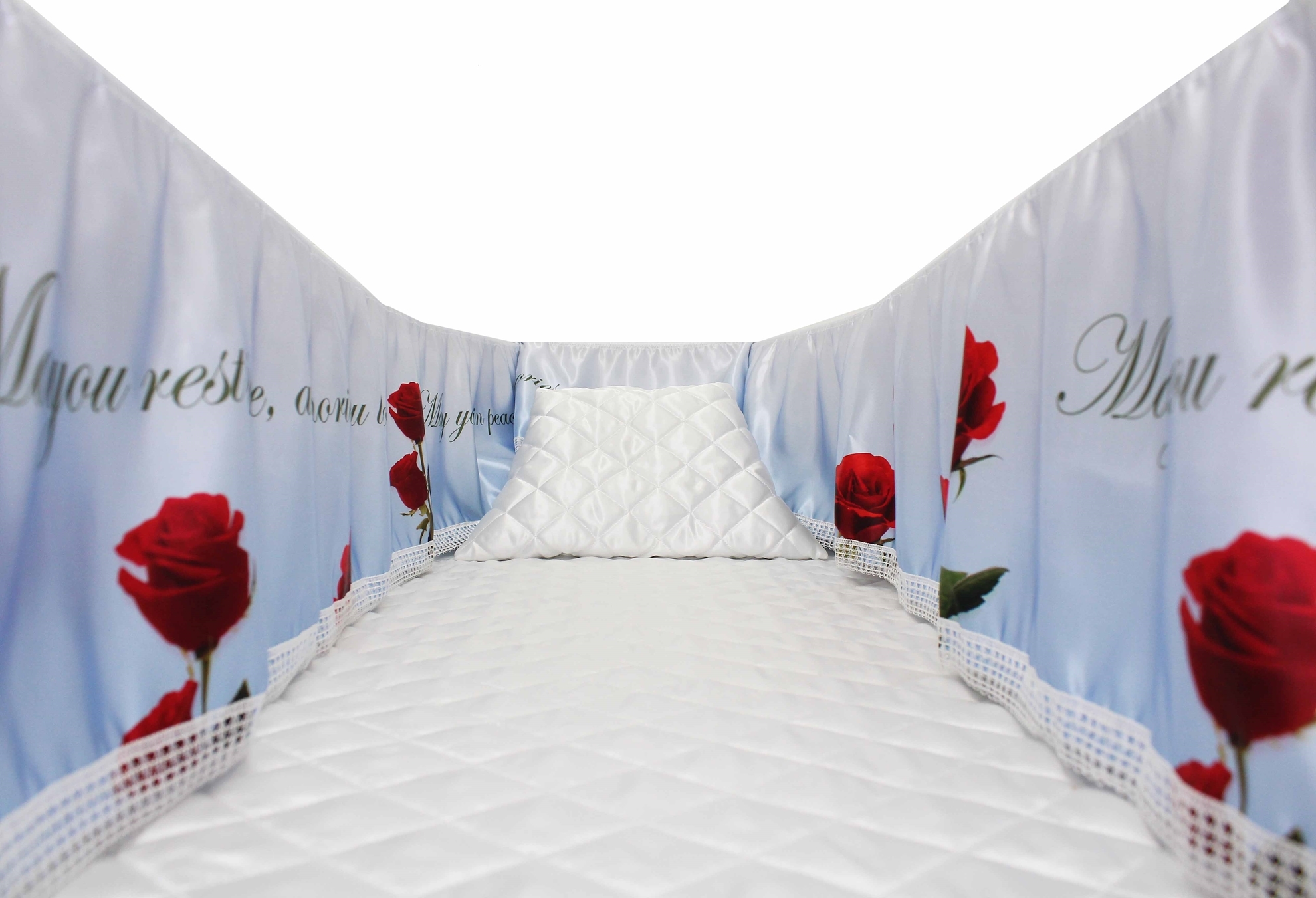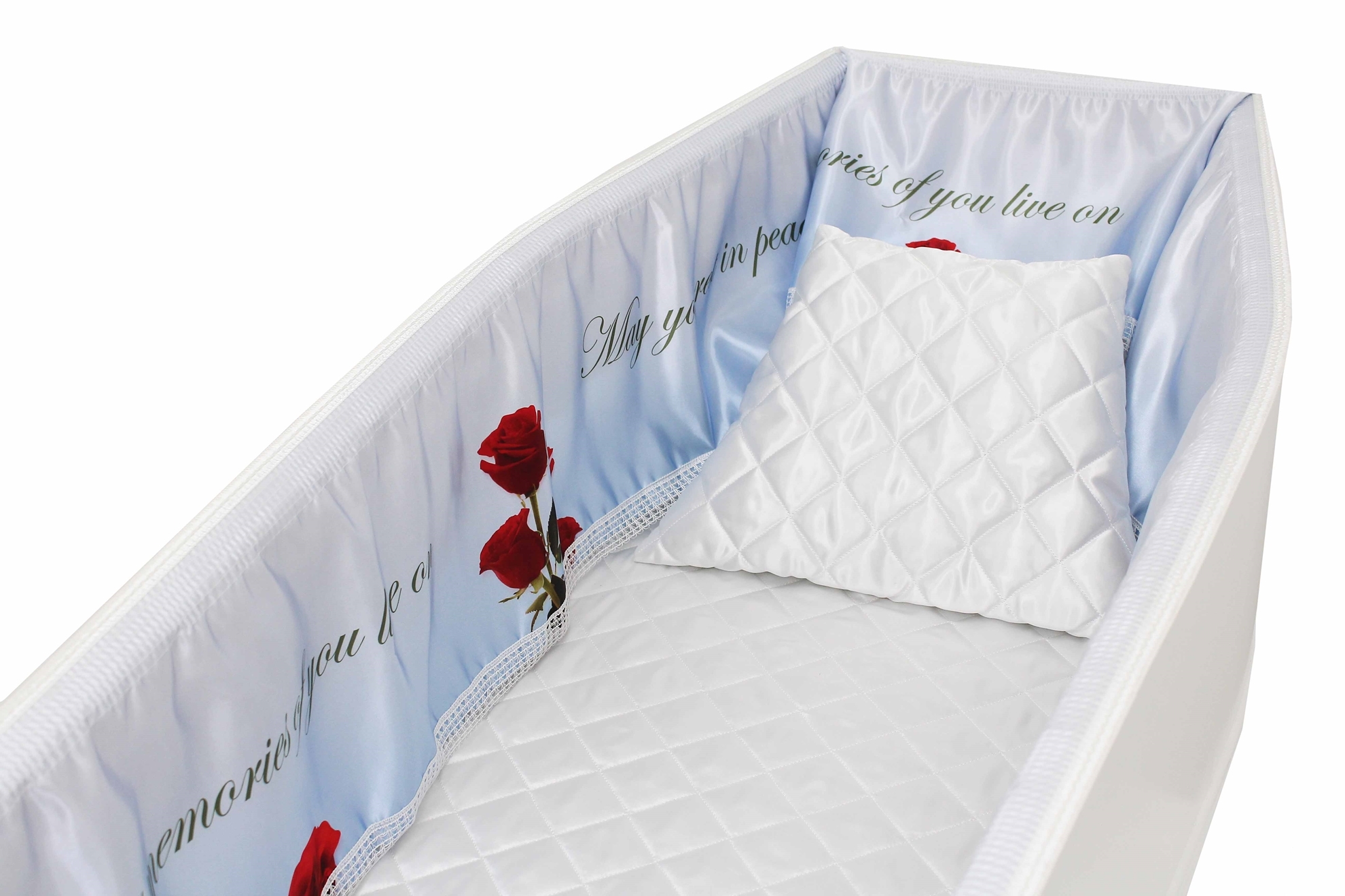 12-inch Printed Satin frill to be attached to the lip of the coffin/casket. Please note the image shows a mattress and pillow which are NOT included.
